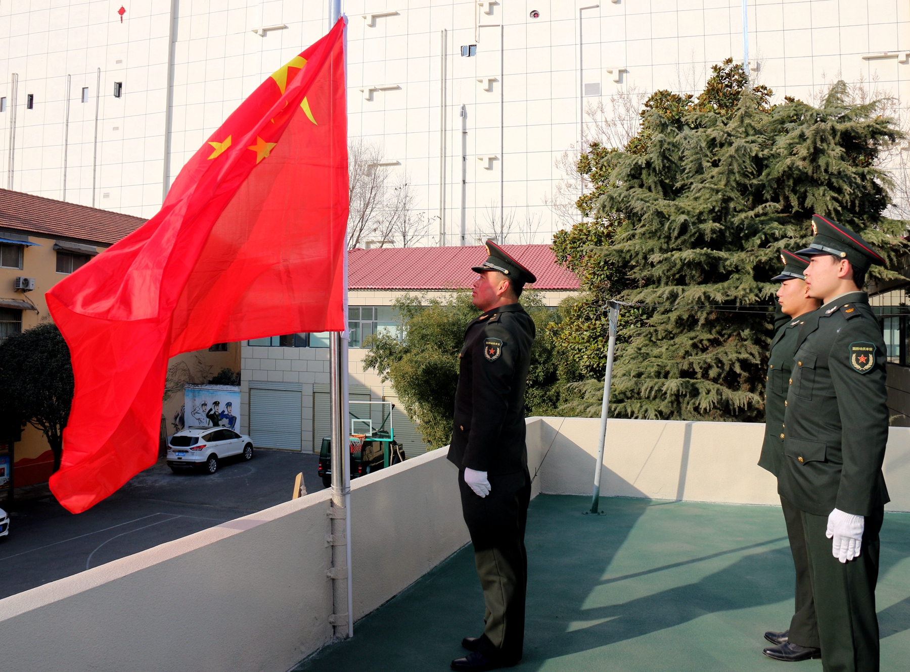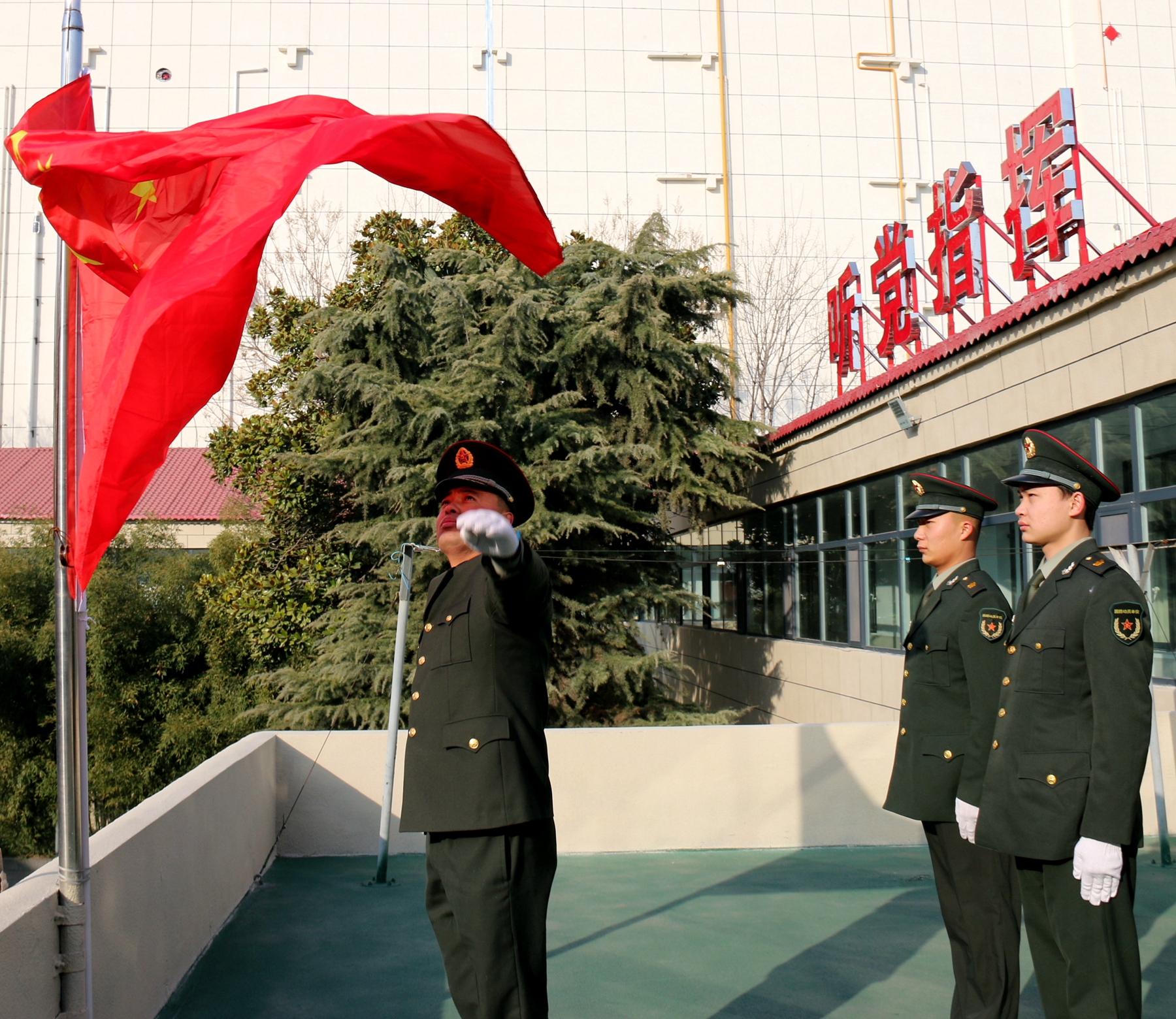 “起來,不愿做奴隸的人們……”,伴隨著激昂雄壯的《義勇軍進行曲》,鮮艷的五星紅旗冉冉升起。2月12日8 時,河南省鹿邑縣人武部干部職工和文職人員士氣高昂、精神抖擻、昂首挺胸、軍容嚴整,在機關樓前整齊列隊,舉行升國旗儀式。他們齊聲高唱國歌,莊嚴地向國旗行舉手禮,向偉大祖國、人民軍隊致以節(jié)日祝福和崇高敬意。