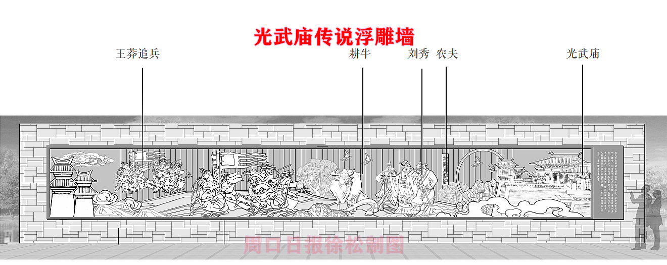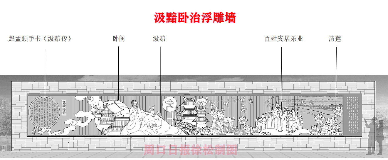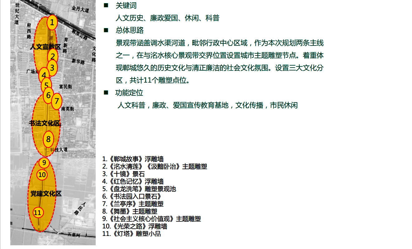 在縣委、縣政府綜合大樓東側(cè)的核心形象段,配合鄲城行政中心打造莊嚴(yán)、大氣氛圍的同時(shí),對(duì)鄲城歷史文化進(jìn)行了集中展示,包括鄲城的歷史沿革,鄲城的發(fā)展理念,歷史故事等。其中調(diào)水渠西側(cè)以現(xiàn)有人民廣場(chǎng)對(duì)應(yīng)的綠地為基礎(chǔ),設(shè)置了較多的歷史文化節(jié)點(diǎn)。如調(diào)水渠新華路橋頭北側(cè)的廉政文化廣場(chǎng),講述了漢朝名臣汲黯的故事。汲黯為人耿直,直諫廷諍,親政愛(ài)民,敢于承擔(dān)責(zé)任,漢武帝劉徹稱其為“社稷之臣”。汲黯廉政廣場(chǎng)建設(shè)在此處更有著深遠(yuǎn)的意義,它一方面提醒老百姓要了解歷史、敬畏先賢,同時(shí)也激勵(lì)著鄲城縣的各級(jí)黨員干部要在習(xí)近平新時(shí)代中國(guó)特色社會(huì)主義思想引領(lǐng)下,“不忘初心、牢記使命、廉潔奉公、一心為民”。