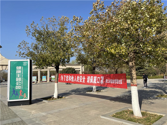 春色正宜結(jié)伴行。2月19日,記者來到周口公園,在公園門口,就看到了“進(jìn)入公園請佩戴口罩”的宣傳標(biāo)語。進(jìn)入公園,藍(lán)天碧水映入眼簾,微風(fēng)輕拂,花香陣陣,放眼望去,遠(yuǎn)處還有孩童在放風(fēng)箏,一派閑適景象……