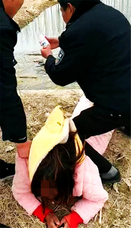 同一時間,該女子的家人也趕到。他們相互配合,民警將這名輕生女從河邊拉出,奪下手中的藥瓶子。