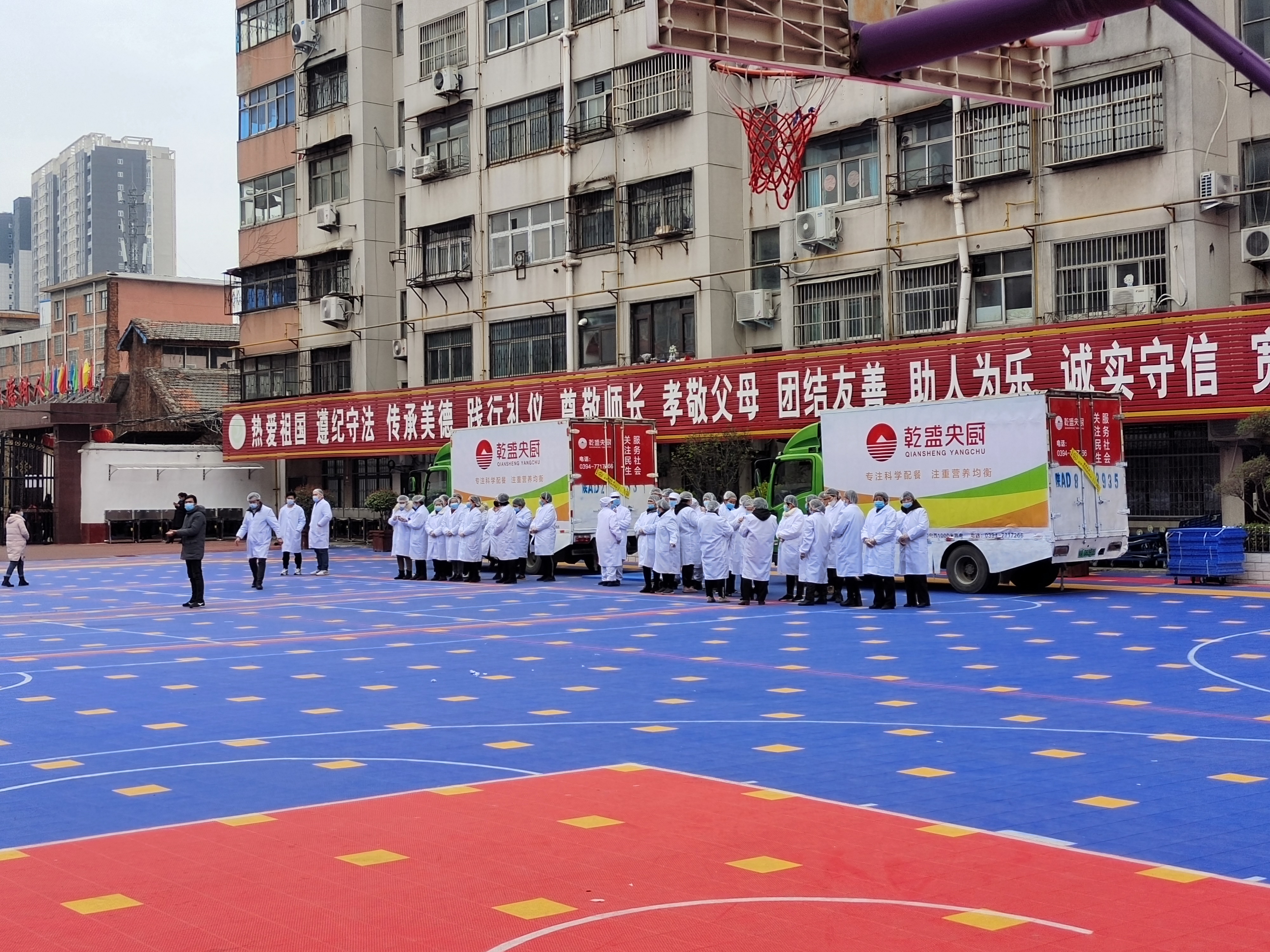 11時(shí)許,13000余份熱騰騰的飯菜即將送到周口市中心城區(qū)中小學(xué)生手中,直播團(tuán)隊(duì)對(duì)七一路二小的配送情況進(jìn)行現(xiàn)場(chǎng)直播。兩輛運(yùn)餐大卡車(chē),20余名工作人員整裝待發(fā),乾盛央廚鄭州總公司的營(yíng)銷(xiāo)部負(fù)責(zé)人現(xiàn)場(chǎng)指揮調(diào)度七一路二小的發(fā)餐工作。揭掉卡車(chē)上的封條,留樣,測(cè)溫,裝車(chē),按班分送,分發(fā)不銹鋼餐具,“哇!獅子頭!!”在孩子們的驚呼聲中,兩葷一素,一份米一份湯,熱氣騰騰地盛到孩子手中的餐具中。“孩子們吃不吃的飽呀?”面對(duì)各直播平臺(tái)上網(wǎng)友的提問(wèn),乾盛央廚鄭州總公司營(yíng)銷(xiāo)部負(fù)責(zé)人回答:“我們提前有準(zhǔn)備,飯、菜我們都免費(fèi)加,保證孩子們都吃飽,請(qǐng)家長(zhǎng)朋友們放心?!?/p>