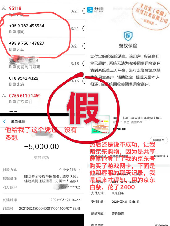 在3個(gè)多小時(shí)的通話里,輕信了騙子的小輝,接連被對方以需要“退回理賠款”和提供“資金流水證明”為借口,騙取了5000元錢的“樂花卡”網(wǎng)貸、2300元的花唄和999元的個(gè)人賬戶資金。由于是共享屏幕,個(gè)人信息泄露無遺,騙子還登錄了小輝的京東賬號,冒充小輝與客服人員聊天,套取了京東白條2400元錢,用于購買游戲網(wǎng)卡。