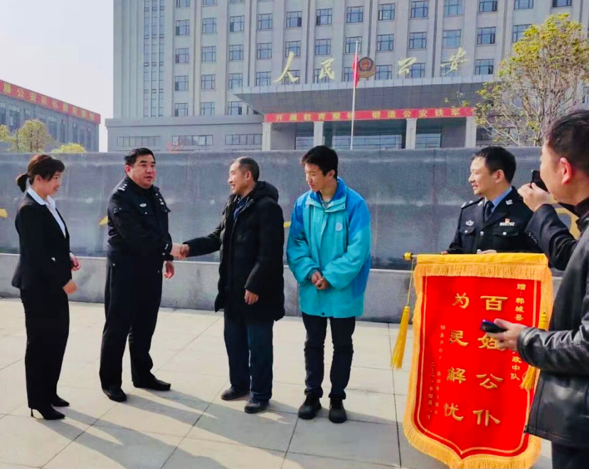 “感謝你們心系百姓,為民解憂?!?月8日,中學生胡某和其爺爺、班主任一起來到鄲城縣公安局,將一面寫有“百姓公仆,為民解憂”的錦旗送到民警手中,感謝連連。