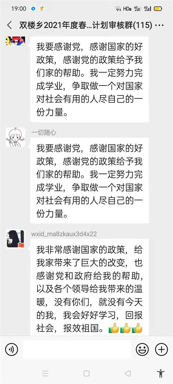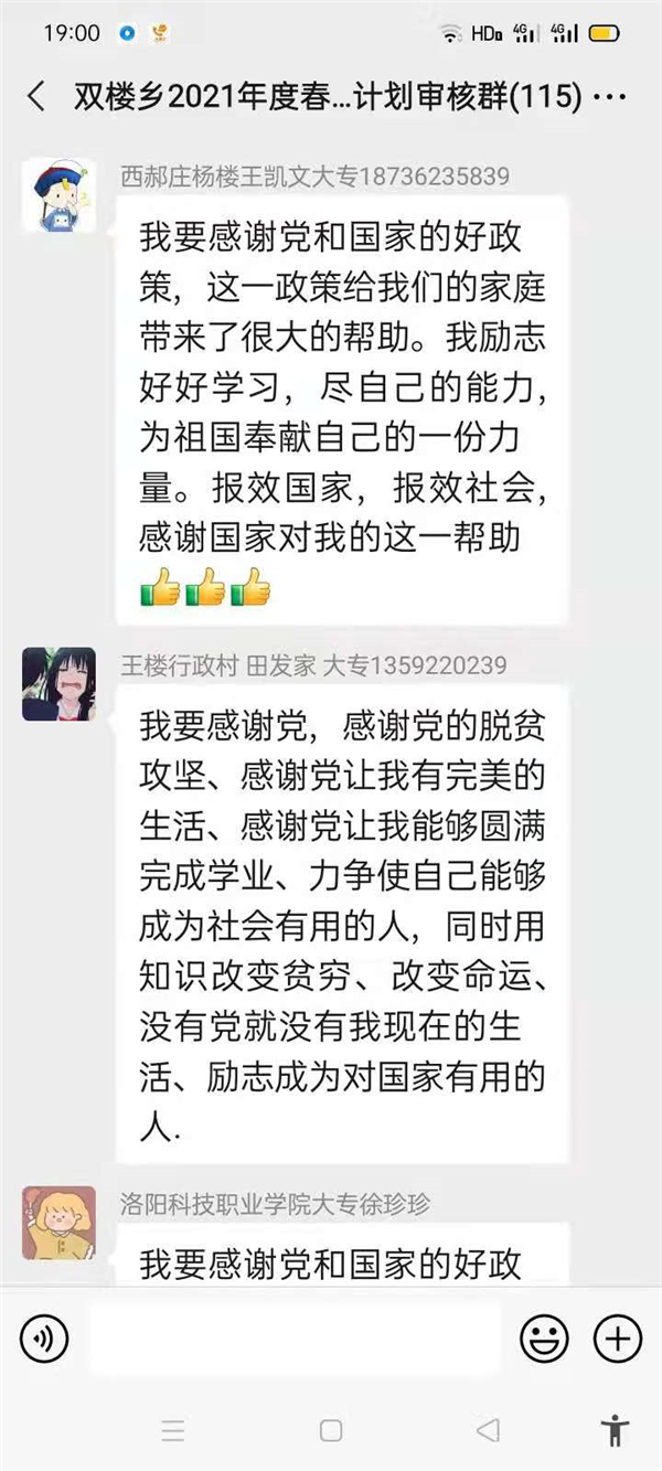 “感謝幫助過(guò)我家的所有幫扶人,沒(méi)有你們,就沒(méi)有我家今天的幸福生活,我們光榮脫貧了,作為貧困家庭中新成長(zhǎng)勞動(dòng)力,我一定珍惜這次來(lái)之不易的學(xué)習(xí)機(jī)會(huì),好好學(xué)習(xí)技術(shù),畢業(yè)后回村成為一名技術(shù)帶頭人,來(lái)促進(jìn)家鄉(xiāng)產(chǎn)業(yè)的發(fā)展。”鄲城縣雙樓鄉(xiāng)孫莊村脫貧學(xué)生張素華在微信群里說(shuō)。近幾天,鄲城縣雙樓鄉(xiāng)114人的大學(xué)生微信群里可熱鬧了,在鄉(xiāng)黨委政府的引導(dǎo)下,該鄉(xiāng)眾多脫貧后的大學(xué)生通過(guò)鄉(xiāng)里建起的微信群,紛紛圍繞“話脫貧、感黨恩、奮進(jìn)新時(shí)代”這一主題交流思想,提振斗志。