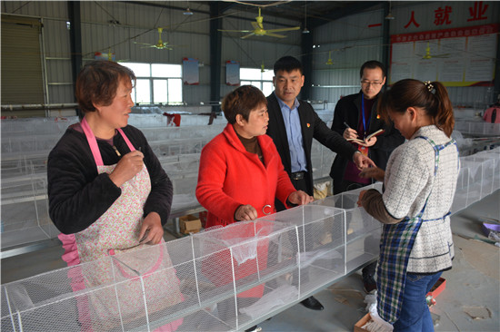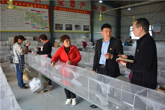 4月11日,商水縣平店鄉(xiāng)大朱莊村扶貧車間里留守女工正在編織漁網(wǎng)。該縣各級(jí)紀(jì)檢部門切實(shí)加強(qiáng)對(duì)扶貧資金資產(chǎn)的監(jiān)督管理,確保了扶貧項(xiàng)目產(chǎn)業(yè)正常運(yùn)行,有效促進(jìn)了廣大留守婦女家門口就業(yè)增收。圖為縣鄉(xiāng)紀(jì)委干部在扶貧車間調(diào)查了解資產(chǎn)管理群眾收益工人收入等情況。