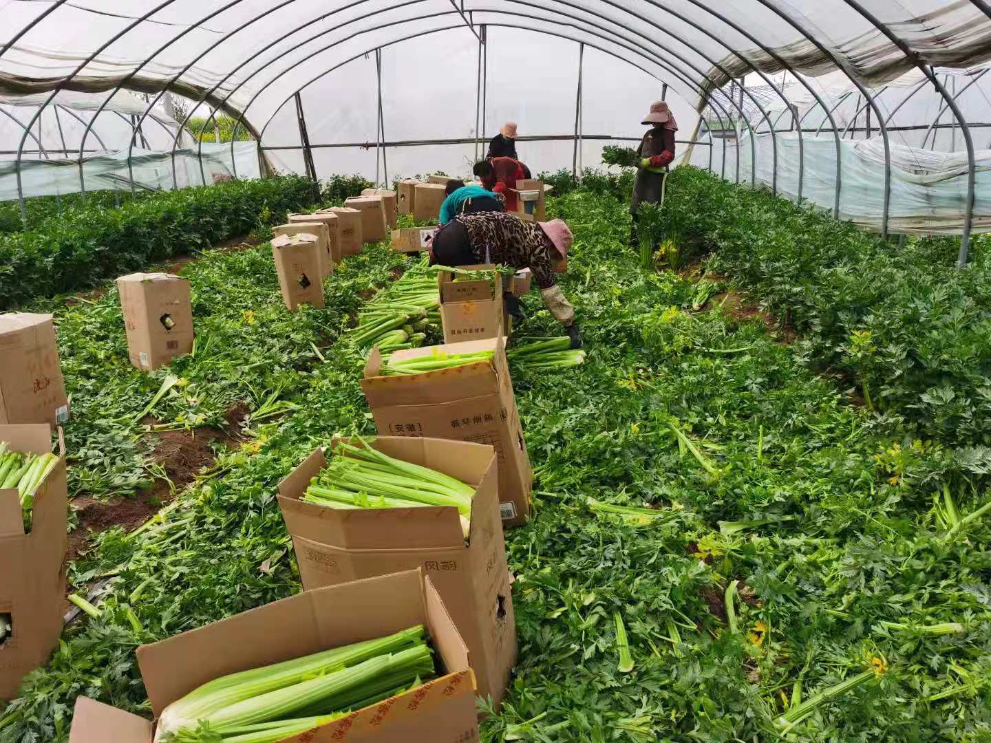 走進(jìn)萬畝芹菜種植基地蔬菜溫棚,一股傘形科植物特有的芳香充滿鼻腔。抬眼一瞅,裝箱好的芹菜整齊碼放成垛,溫棚深處,還有大片未收割的芹菜,挺直鮮嫩,綠意蔥蘢。大棚里菜農(nóng)們收割、打包、貼二維碼一氣呵成,道路兩旁十幾名從全國各地趕來的收購商從菜農(nóng)手中接過包裹急忙裝車。