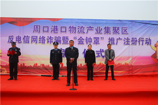 為打擊治理電信網(wǎng)絡(luò)詐騙犯罪,降低詐騙案件發(fā)生率,4月13日,周口港區(qū)舉辦反電信網(wǎng)絡(luò)詐騙宣傳暨“金鐘罩”推廣注冊行動啟動儀式,宣傳反電詐知識,推廣公安部門推出的反詐騙系統(tǒng)平臺“金鐘罩”。港區(qū)黨委書記孫鵬到場宣布行動正式啟動,港區(qū)黨委委員、紀(jì)委書記李素芹,公安分局局長康群泉在儀式上講話。