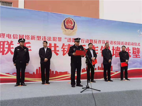 4月18日上午,鄲城縣打擊治理電信網(wǎng)絡(luò)新型違法犯罪“迅雷”行動暨反詐宣傳進(jìn)校園活動儀式在縣三高啟動。縣政府副縣長、公安局長陳鳳祥,縣政府辦公室主任賈培民,縣教體局黨組書記、局長羅明黨等出席啟動儀式,縣打擊治理電信網(wǎng)絡(luò)新型違法犯罪工作各成員單位、縣公安局、縣三高分別組成代表隊(duì)2200余人參加啟動儀式,儀式由賈培民主持。
