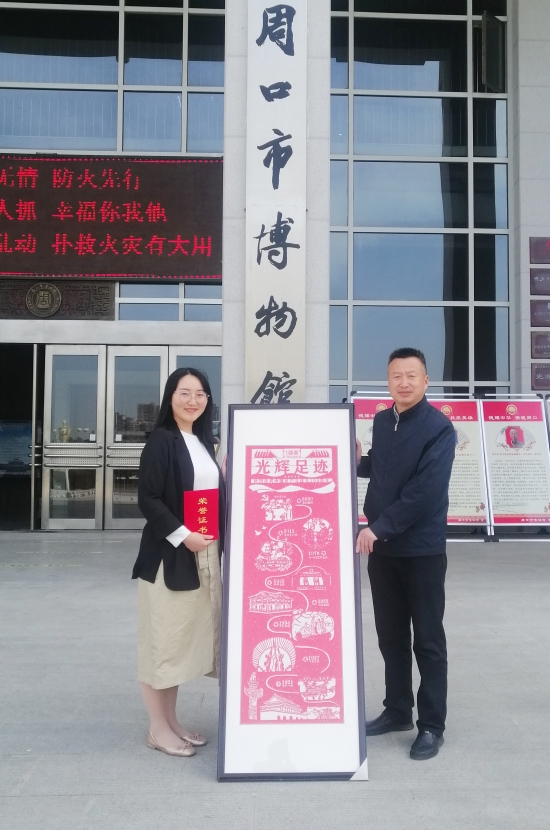 4月28日,河南科技職業(yè)大學老師范文華來到周口市博物館,將自己的剪紙作品“光輝足跡”捐贈給周口市博物館,在建黨100周年之際,表達一位教育工作者的殷殷之情。周口市博物館館長周建山向其頒發(fā)榮譽證書。