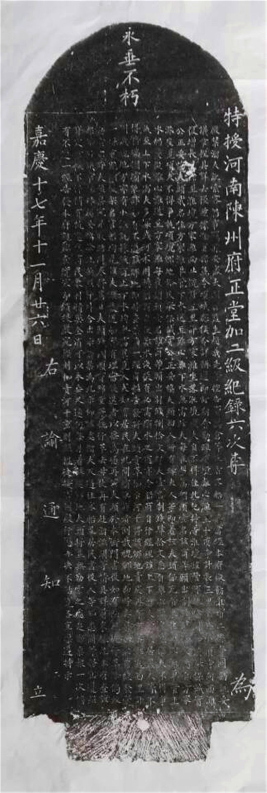 說它“緘默不語”,其實并不準(zhǔn)確。這通石碑通體有字,碑的陽面為清同治八年四月十六日淮沈項分縣縣丞孫茂悟所刊刻的嚴(yán)禁溜夫訛索客船事告示,碑的陰面為附文,內(nèi)容為重刊的清嘉慶十七年十一月二十六日陳州知府李振翥制定的嚴(yán)禁溜夫訛索客船事章程,是對公告內(nèi)容的重申,兩面碑文內(nèi)容大致相同,加起來共有1100余字,均為約束溜夫行為的公告或章程。碑首追刻的有四個大字:永垂不朽。
