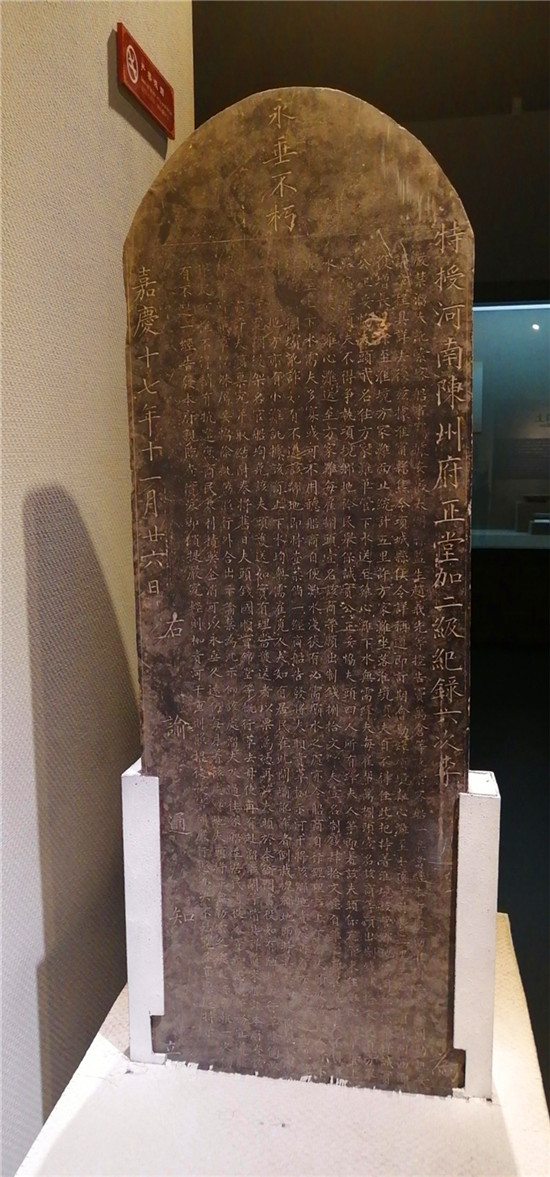 這家店的主人叫段清海,他從事刻碑行業(yè)多年,經(jīng)驗頗豐,從第一眼看到這通石碑,憑直覺就感覺它來歷不凡?!爱?dāng)時那個人把這通碑送到店里,要求把上面的字磨掉,重新刻成一塊墓碑。我仔細(xì)一看,這通碑的表面雖然有些微磨損,字跡稍顯模糊,但細(xì)致觀察,能發(fā)現(xiàn)碑文的落款為清嘉慶十七年(1812年)和清同治八年(1869年)。也是不忍心吧,我沒有把它毀掉,而是免費為那個人刻了一通新碑,就把這通年代久遠(yuǎn)的舊碑留下來了。”段清?;貞浾f,2012年的時候,他聽說周口市博物館面向全市征集古物,他第一時間把石碑送交到周口市博物館,沒有要一分錢,“它在我的店里放了四年,期間好幾次差點被送貨拉貨的工人損壞,交給博物館總算是給它找了一個‘安穩(wěn)’的家,我的心里也算踏實了”。