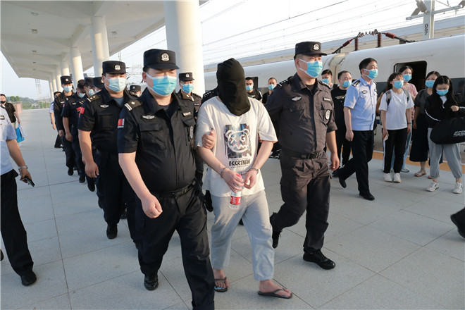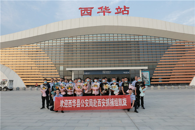 當天,西華縣公安局在鄭阜高鐵西華站舉行歡迎儀式,迎接赴西安抓捕組凱旋歸來。特警在站臺上排列整齊、嚴陣以待,列車準時??康秸?,7名犯罪嫌疑人隨即被押解下車,全副武裝的特警立即上前進行押解交接,押往在高鐵出站口等候的裝甲車上。至此,歷經(jīng)三天三夜,一起電信網(wǎng)絡詐騙團伙案成功告破。