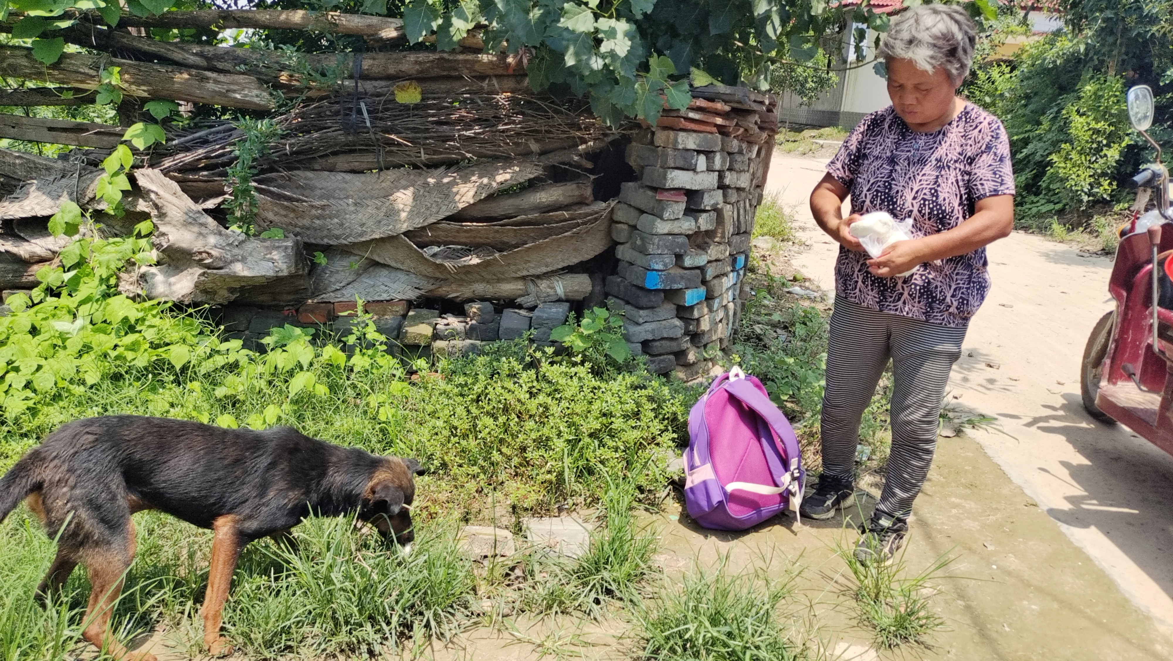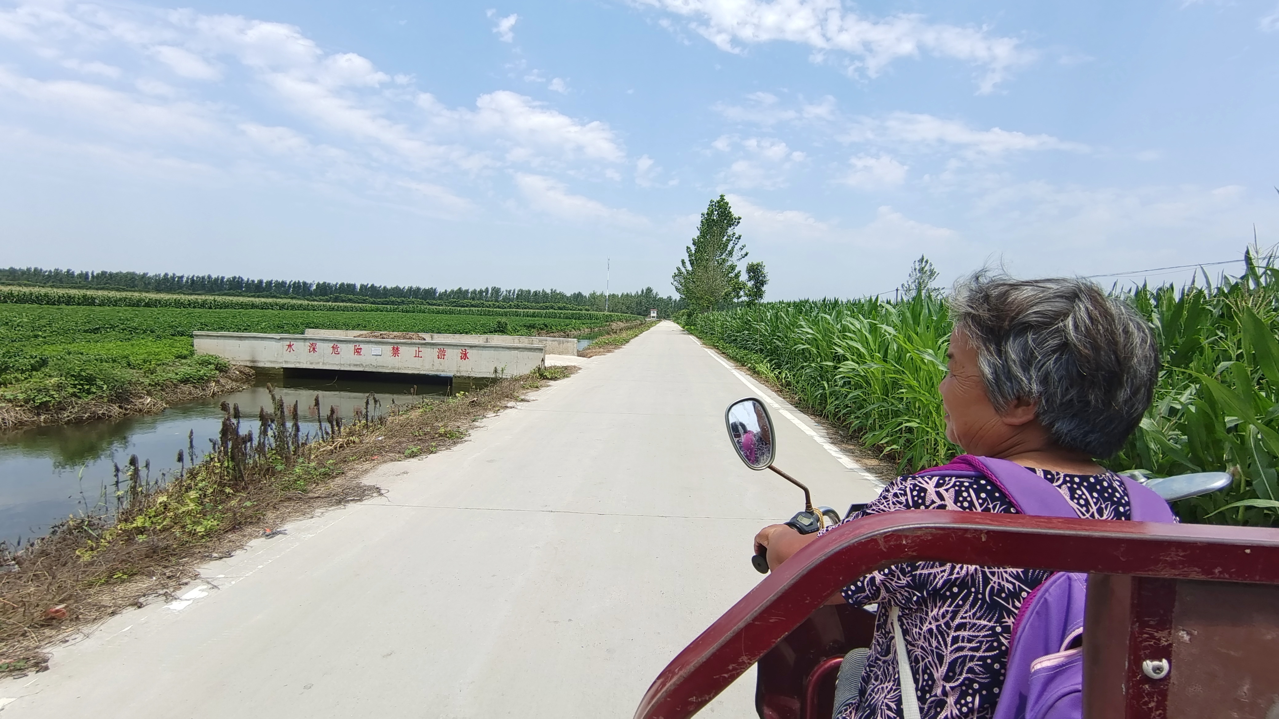 駛出不到幾百米,張梅碰到鄰居王妞的電動(dòng)三輪車沒電了,這可讓王妞急出一把汗。她們一商量,就在車上找了一段舊條幅,由張梅的機(jī)動(dòng)三輪車牽著王妞的電動(dòng)三輪車?yán)^續(xù)趕路。