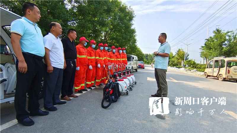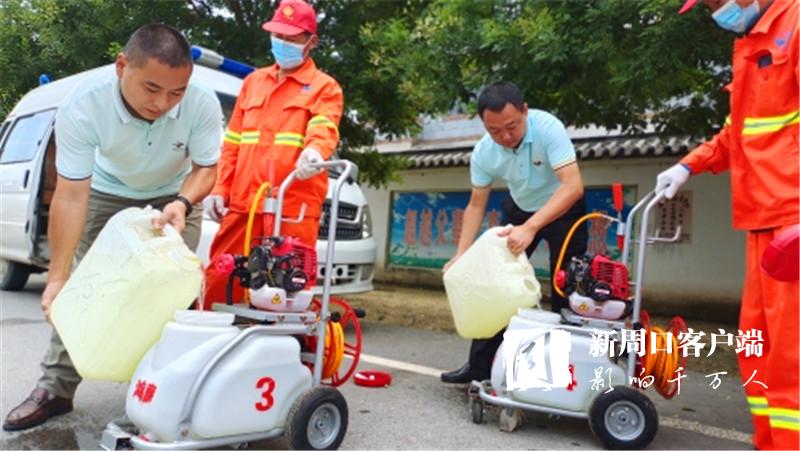 “老關(guān),你們?nèi)膫€人去女媧景區(qū)消殺。老王,老溫你們兩個人去村莊消殺,尤其是旮旯處、垃圾堆、屋后等隱蔽重點區(qū)域一定消殺徹底,不留空白。在村莊內(nèi)進行消殺時,一定要和群眾交代好防疫消毒時的注意事項?!?月30日9時許,來自廣州市鴻鷹害蟲防治服務(wù)有限公司周口分公司的10多名愛心人士載著4臺機動手推式滯留噴霧機、1臺電動背負式超低容量噴霧機、1臺大型車載式超低容量噴霧機和230公斤消毒劑,來到西華聶堆鎮(zhèn)思都崗村后,該公司負責人許金山就向工作人員一一分配消殺任務(wù)。