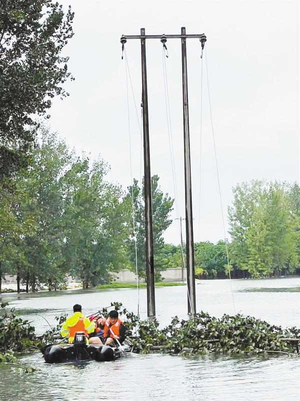 國(guó)網(wǎng)周口供電公司職工駕駛沖鋒舟在水中搶修線路。童之潔 攝