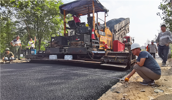 路面鋪油作業(yè)從淮陽區(qū)葛店鄉(xiāng)與鄲城縣李樓鄉(xiāng)交界處開始,一臺(tái)攤鋪機(jī)鋪設(shè)寬度為7米,壓實(shí)厚度為5厘米,以平均每分鐘5米的速度前行,數(shù)輛運(yùn)料車輪流供料給攤鋪機(jī)。攤鋪機(jī)過后,兩臺(tái)壓路機(jī)交替運(yùn)行,立即把路面壓實(shí);兩臺(tái)灑水車配合作業(yè),路面一次成型,寬闊而平坦。