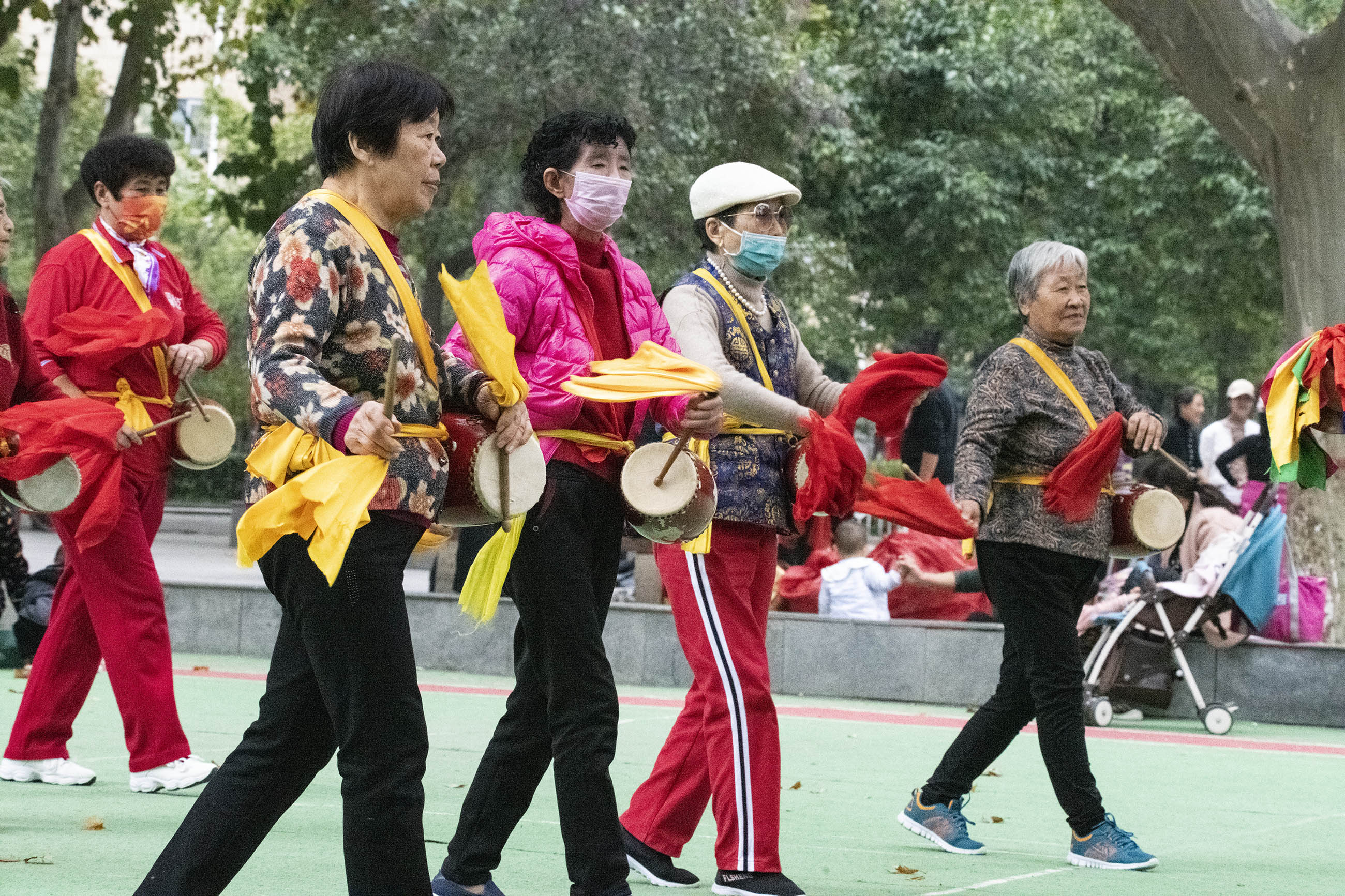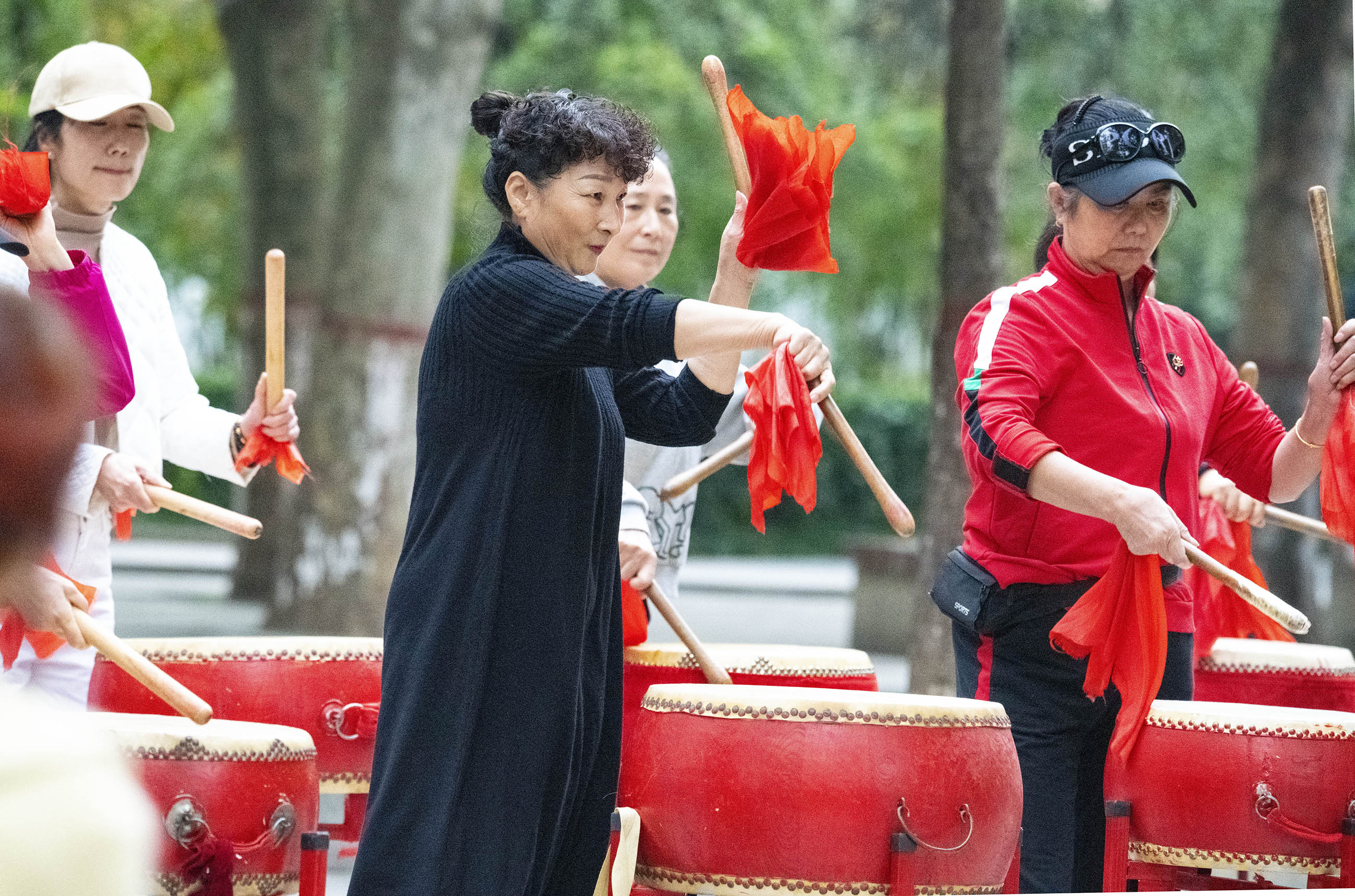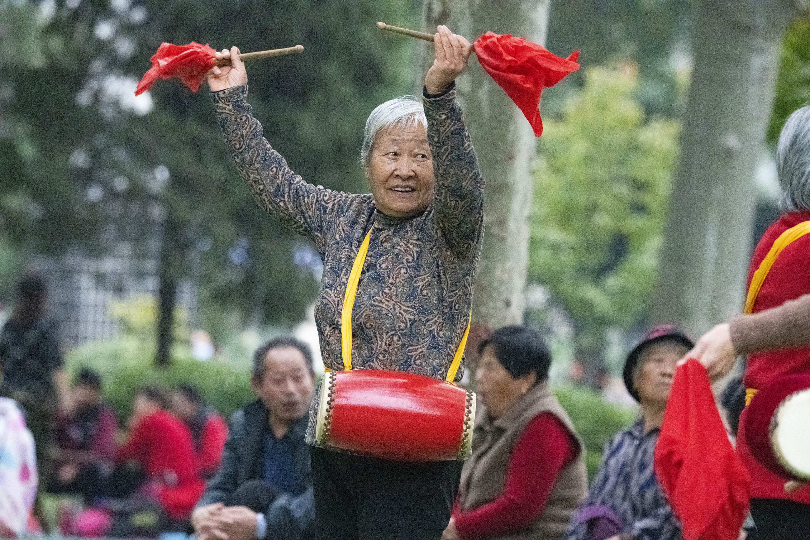 10月26日下午,在周口人民公園,老人們打腰鼓、敲盤鼓、扭秧歌,盡享晚年快樂生活。