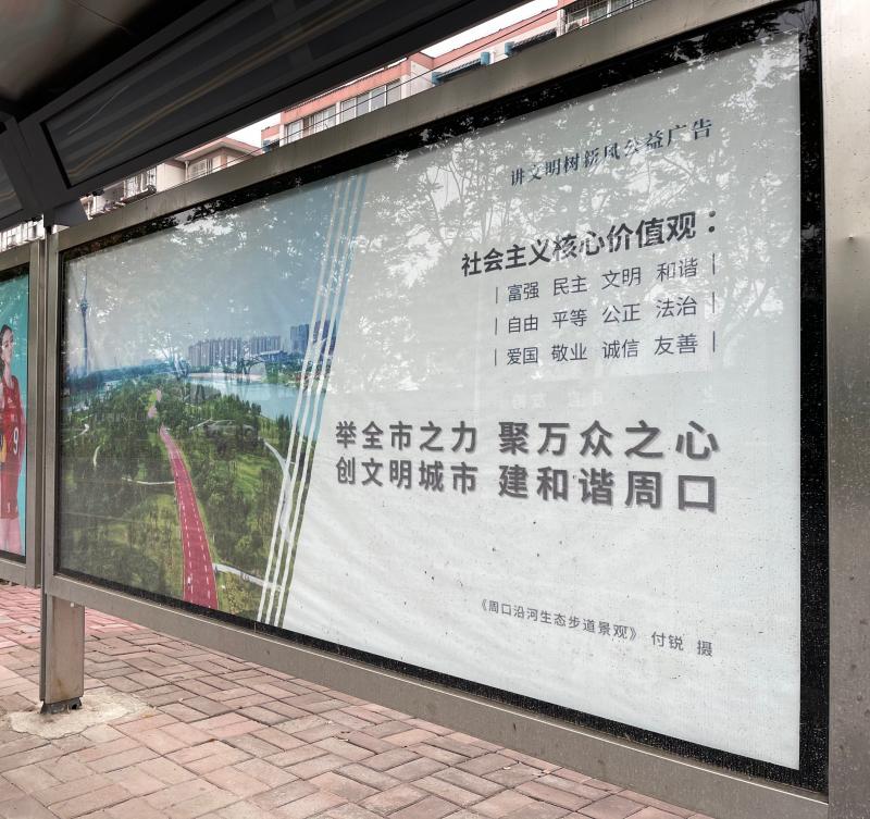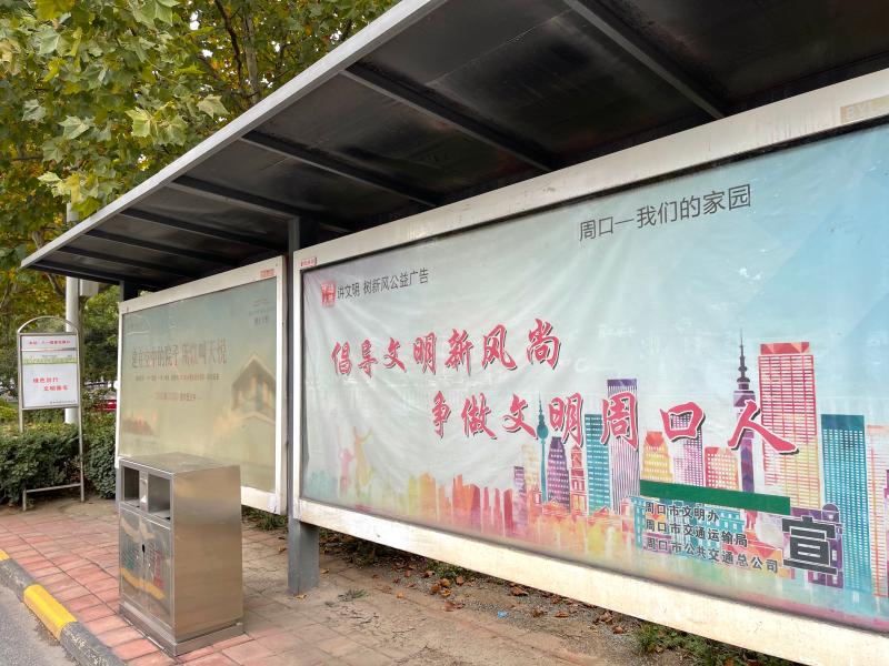 公交站臺(tái)作為城市文化傳播的符號(hào)之一,對(duì)城市形象的提升有著重要意義。10月26日,記者走訪了我市中心城區(qū)公交候車臺(tái),隨處可見(jiàn)的公益廣告牌引人注目,“文明與你同行,創(chuàng)建從我做起”“倡導(dǎo)文明新風(fēng)尚,爭(zhēng)做文明周口人”“舉全市之力,聚萬(wàn)眾之心,創(chuàng)文明城市,建和諧周口”,一句句文明標(biāo)語(yǔ)為周口創(chuàng)建全國(guó)文明城市增光添彩。