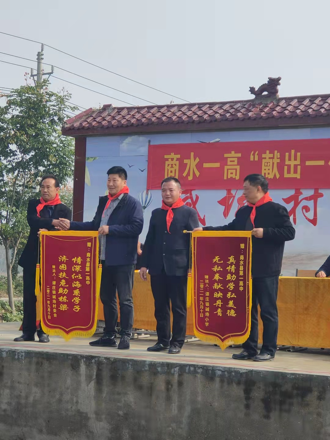 譚莊鎮(zhèn)堿場村村委會(huì)、譚莊鎮(zhèn)堿場小學(xué)分別向商水一高贈(zèng)送內(nèi)容為“真情助學(xué)弘美德,無私奉獻(xiàn)映丹青”“情深似海系學(xué)子,濟(jì)困扶危助棟梁”的錦旗。