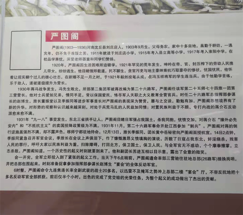 據(jù)了解,為了緬懷革命先烈,嚴(yán)圖閣烈士犧牲之地——湖南平江蘆頭已被打造成為紅色黨性教育基地。(相關(guān)文字報道及視頻,周口報業(yè)傳媒集團將陸續(xù)推出。)③2