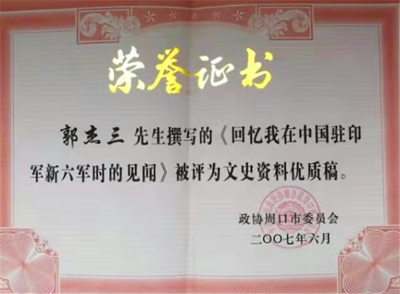 2005年9月3日,時任中共中央總書記、國家主席、中央軍委主席胡錦濤發(fā)表了《在紀念中國人民抗日戰(zhàn)爭暨世界反法西斯戰(zhàn)爭勝利60周年大會上的講話》,正視了正面戰(zhàn)場國民黨軍隊抗戰(zhàn)的歷史。之后,父親才給我講述他遠征抗日的經歷,并撰寫了《回憶我在中國駐印軍新六軍時的見聞》一稿,刊登在2007年《周口文史資料》上。政協(xié)為表彰父親的貢獻,特別頒發(fā)了“文史資料優(yōu)質稿”獎狀。