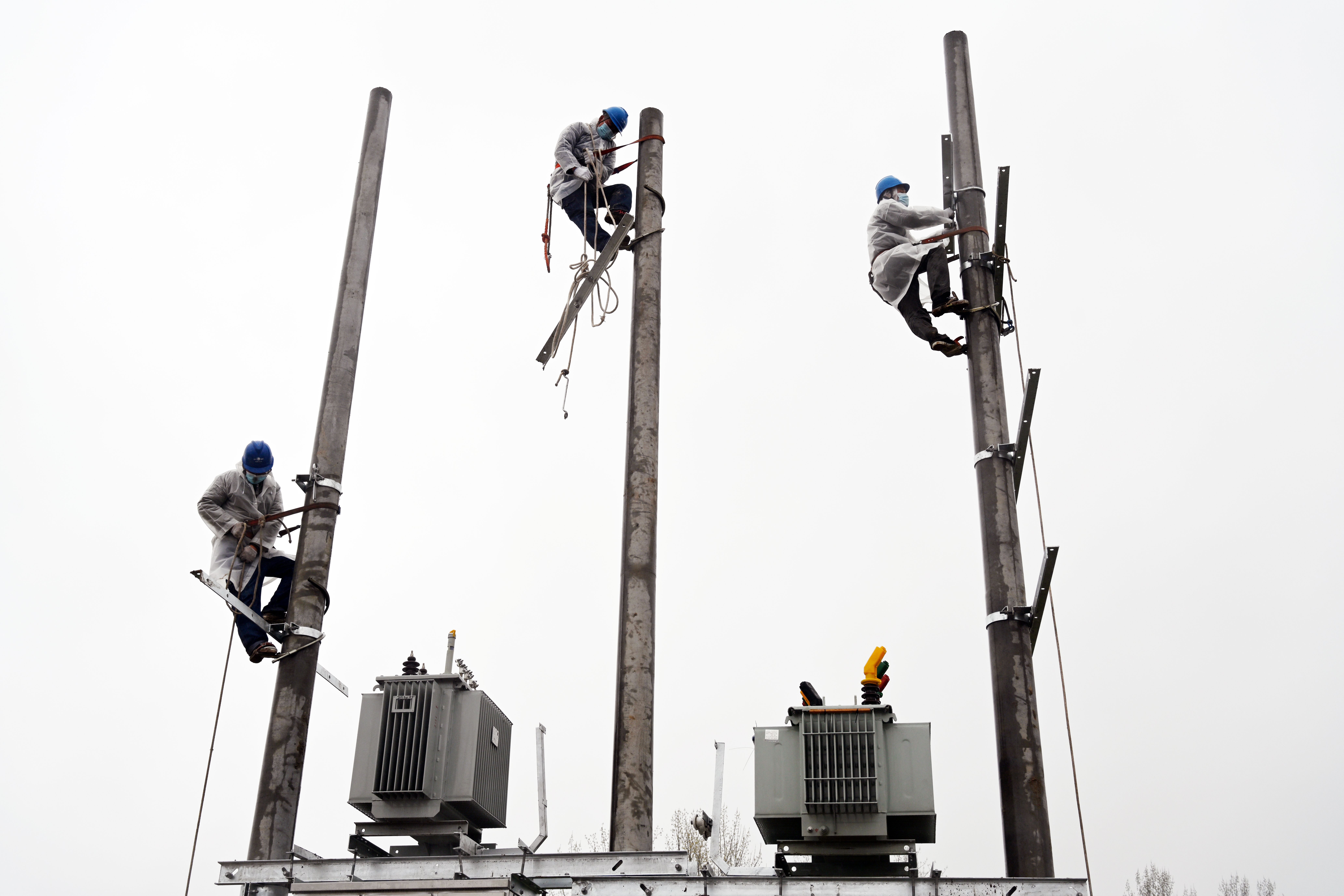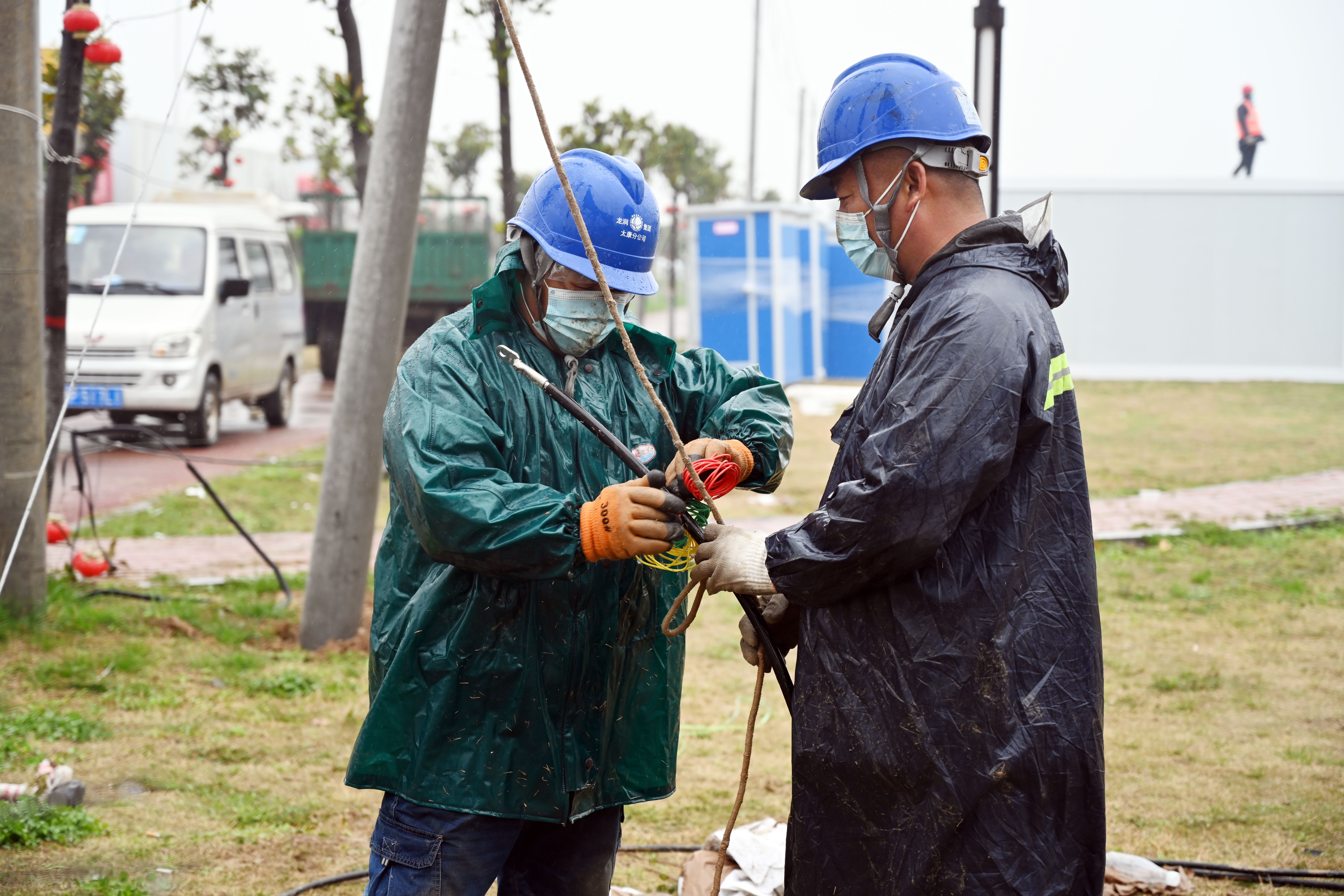 3月25日,在太康縣北環(huán)路核酸檢測方艙和隔離方艙建設現場,國網太康縣供電公司工作人員正冒雨施工為其提供電力保障。