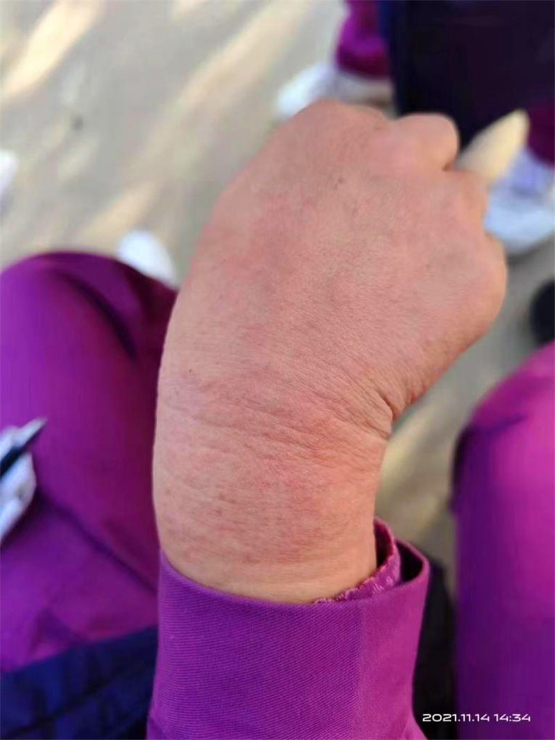 手部出現(xiàn)嚴重過敏反應(yīng),局部出現(xiàn)紅腫、皮疹癥狀