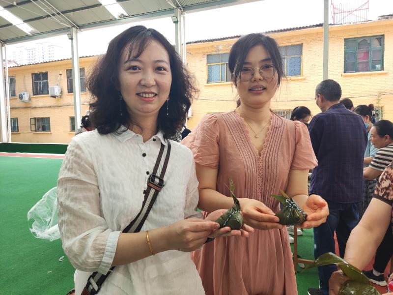 “雖然我平常很少包粽子,但還是挺簡單的?!蔽乃蓮娺呎f邊包,用繩子將粽子纏繞好,用牙咬住繩子的一頭,一手拿粽子,另一手將繩子打結(jié)。整個過程一氣呵成,引來不少人前來學習。