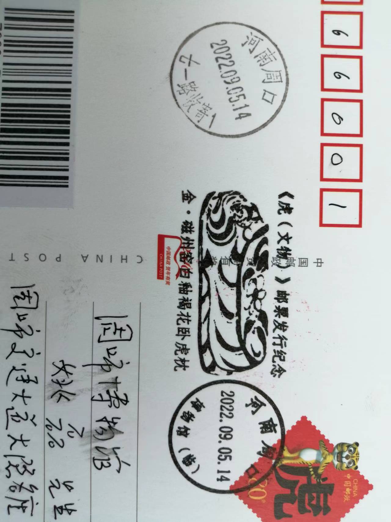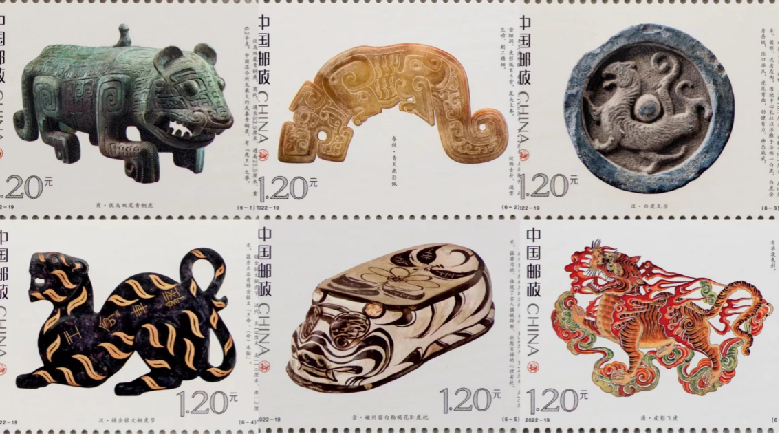9月5日,由中國郵政特別制作的《虎文物》特種郵票正式發(fā)行。此套郵票共有6枚,每枚上都印有一件珍貴的虎文物。郵票圖案名稱分別為“商·伏鳥雙尾青銅虎”“春秋·青玉虎形佩”“漢·白虎瓦當(dāng)”“漢·錯(cuò)金銘文銅虎節(jié)”“金·磁州窯白釉褐花臥虎枕”“清·皮影飛虎”。其中第五枚郵票圖案中的“金·磁州窯白釉褐花臥虎枕”就是來自周口市博物館的珍貴文物,該郵票運(yùn)用光油和浮雕擊凸工藝,塑造了虎安詳、可愛的形象。