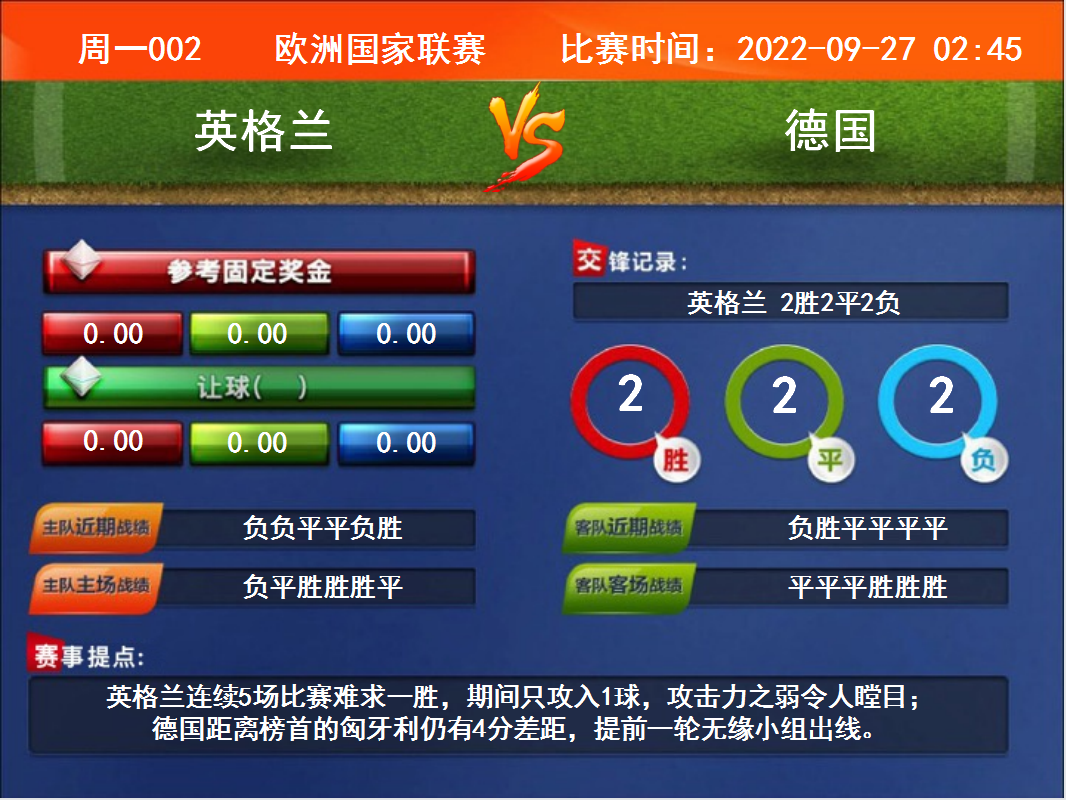 比賽時(shí)間:2022-09-27 02:45賽事提點(diǎn):英格蘭連續(xù)5場(chǎng)比賽難求一勝,期間只攻入1球,攻擊力之弱令人瞠目;德國(guó)距離榜首的匈牙利仍有4分差距,提前一輪無緣小組出線。