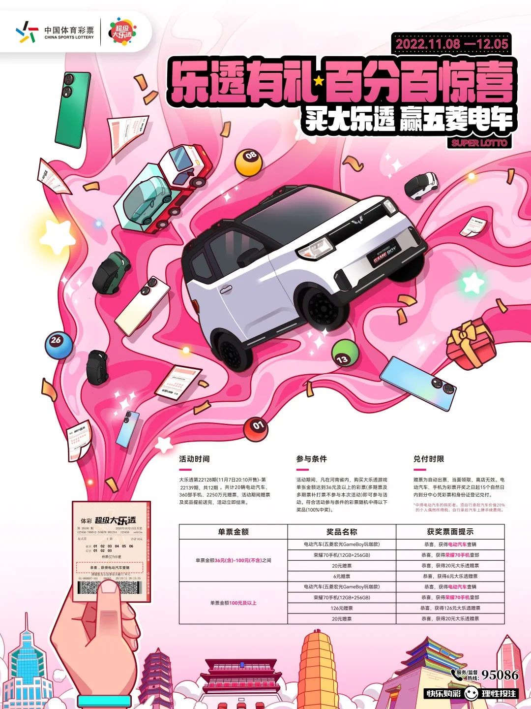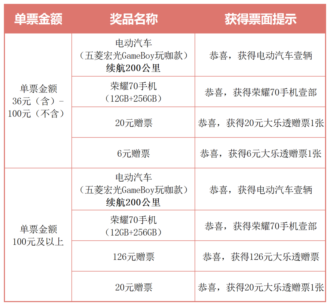 活動期間,凡在河南省內(nèi),購買大樂透游戲單張金額達(dá)到36元及以上的彩票(多期票及多期票補(bǔ)打票不參與本次活動,以下同)即可參與活動。有機(jī)會中得電動汽車、榮耀70手機(jī)、126元贈票、20元贈票、6元贈票等。