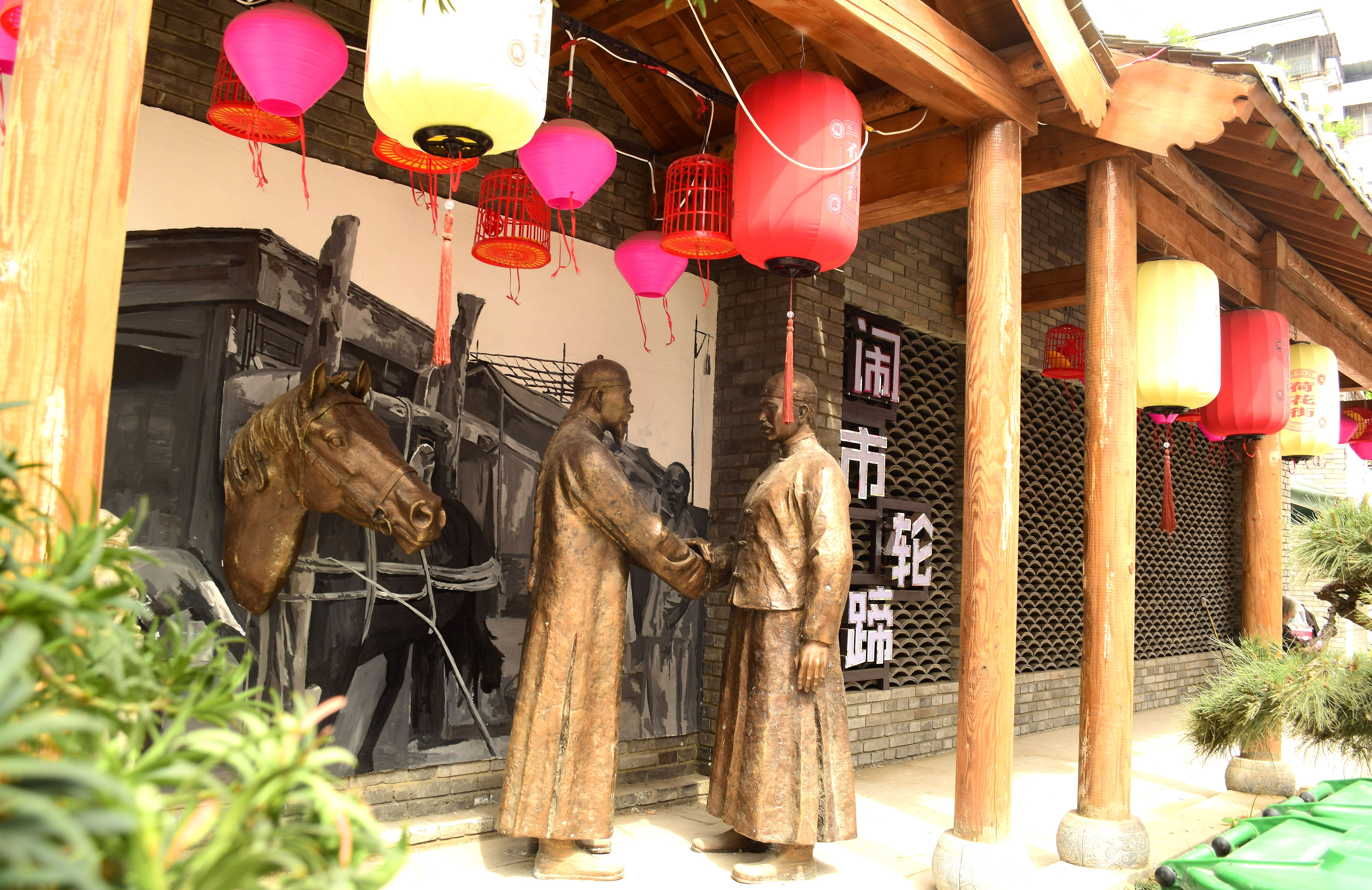 5月16日上午,記者在荷花街看到,其沿街仿古式游廊又增添了“鬧市輪蹄”雕塑,向人們再現(xiàn)了隱身到歷史深處的古街風(fēng)情。