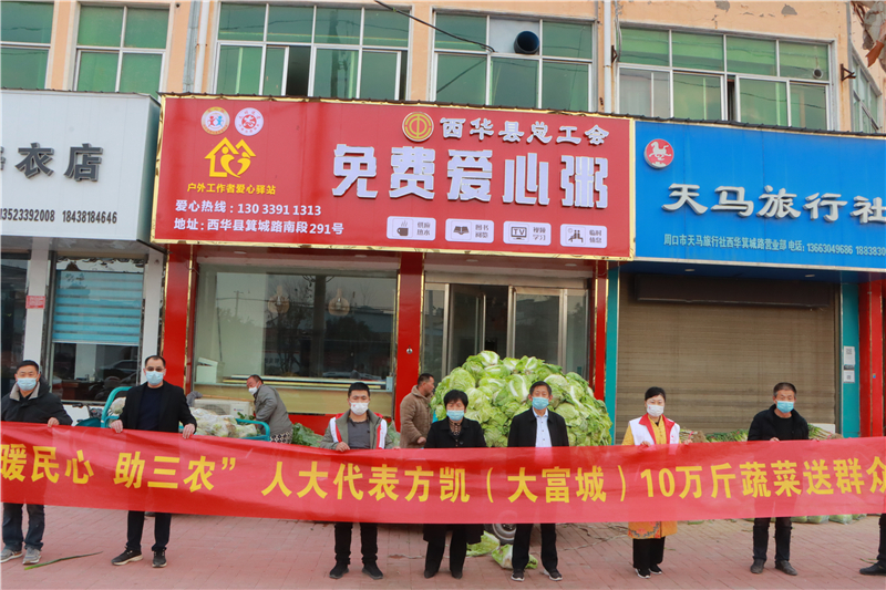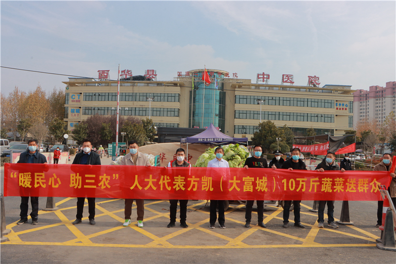 近日,方凱了解到西華縣黃橋鄉(xiāng)菜農(nóng)蔬菜滯銷的問題,便立即到現(xiàn)場(chǎng)察看,當(dāng)即決定幫助菜農(nóng)解決蔬菜滯銷難題,購買10萬斤蔬菜,并將這些蔬菜捐贈(zèng)給縣人民醫(yī)院、中醫(yī)院、敬老院等單位。