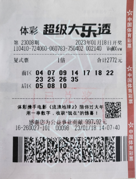 超級大樂透第23008期開獎,前區(qū)開出號碼“04、09、17、22、25”,后區(qū)開出號碼“01、05”。李先生憑借這張超級大樂透中得2注二等獎74272元,1注三等獎10000元,60注五等獎18000元,30注七等獎3000元,300注八等獎4500元,550注九等獎2750元,獎金合計112522元。