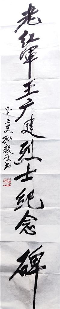 王廣建烈士紀(jì)念碑前是事跡簡(jiǎn)介。碑文是孫毅95歲高齡時(shí)為王廣建的題詞“老紅軍王廣建烈士紀(jì)念碑”金色大字。