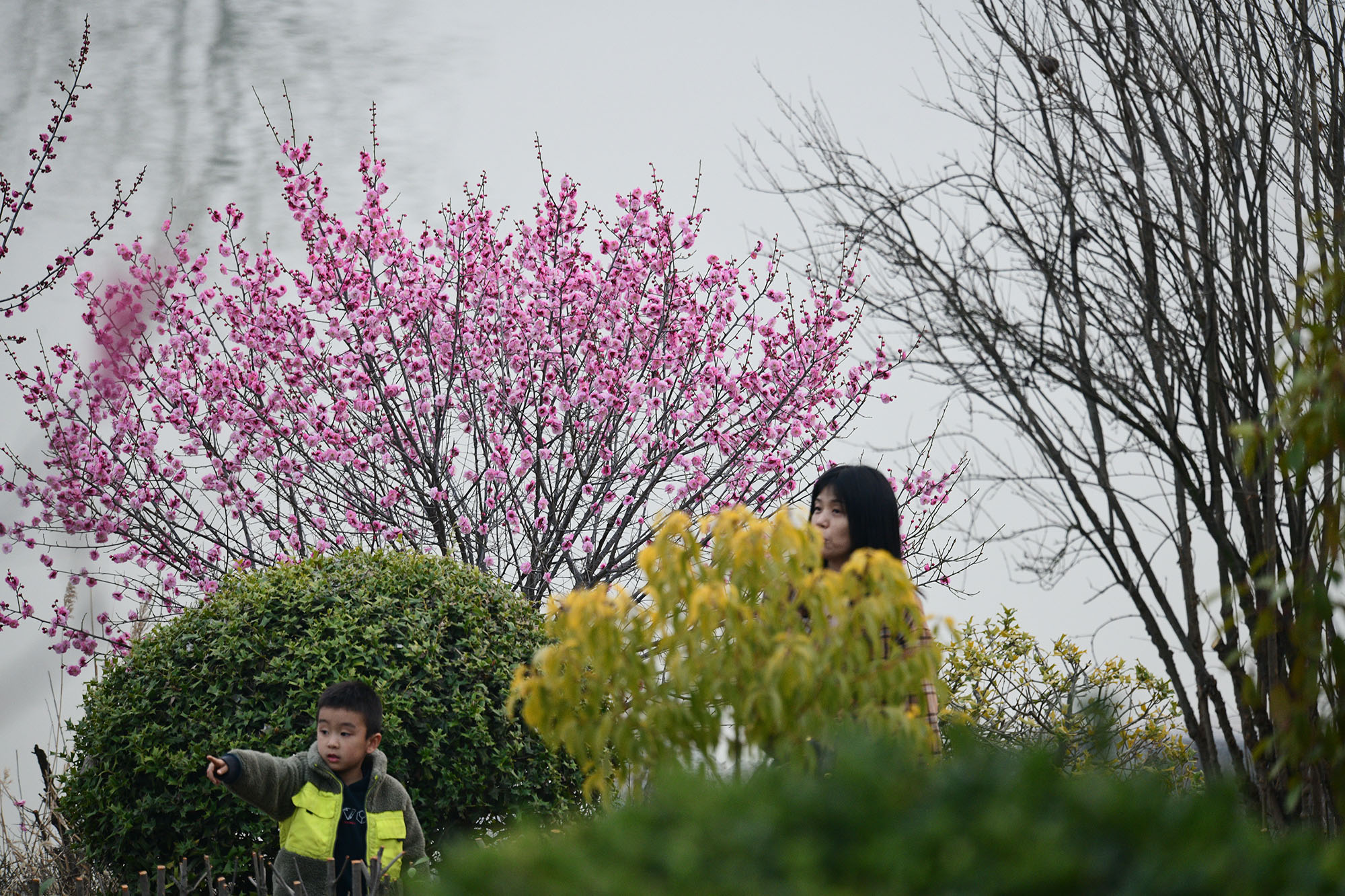 家長帶著孩子在紅梅盛開的花叢間玩耍