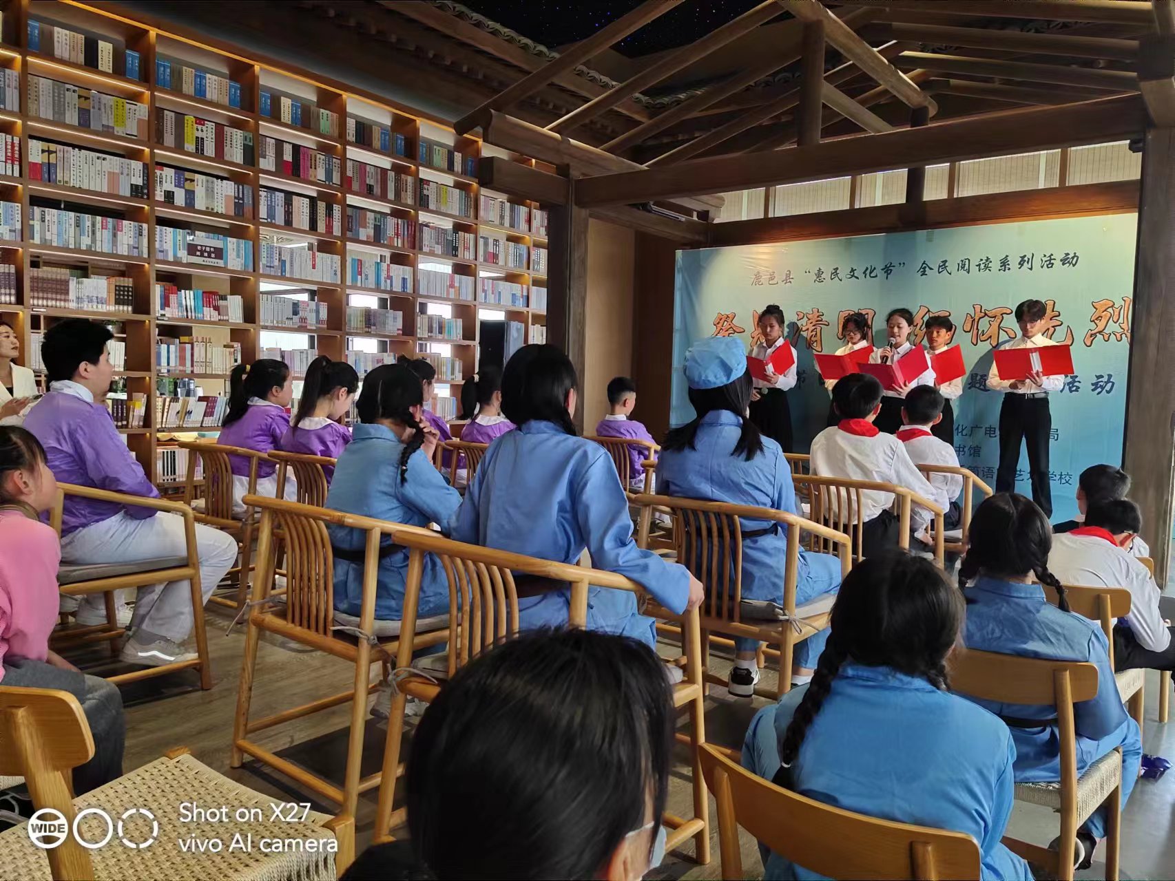 活動由該縣文化廣電和旅游局主辦,縣圖書館承辦,旨在緬懷追憶革命先烈英雄事跡,持續(xù)深化“惠民文化節(jié)”全民閱讀系列活動,向青少年學(xué)生普及清明節(jié)文化知識。當(dāng)日,在該縣圖書館三樓,縣圖書館工作人員講述全縣部分革命先烈英雄事跡和悲壯故事;縣文化廣電和旅游局工作人員講解清明節(jié)由來、清明節(jié)習(xí)俗、清明節(jié)為什么要文明祭祀、清明節(jié)為什么要祭祀和掃墓等知識;身著“小八路軍裝”的青少年學(xué)生依次登臺,聲情并茂地朗誦《中國人清明節(jié)》《清明的雨》《我愛你中國》《鄉(xiāng)愁》《清明詩詞》《不朽》《青松禮贊》《穿越時空的對話》等經(jīng)典詩詞,表達(dá)對革命先烈的無限崇敬和緬懷。
