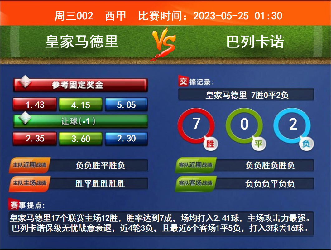 比賽時(shí)間:2023-05-25 01:30 賽事提點(diǎn):皇家馬德里17個(gè)聯(lián)賽主場12勝,勝率達(dá)到7成,場均打入2.41球,主場攻擊力最強(qiáng)。巴列卡諾保級無憂戰(zhàn)意衰退,近4輪3負(fù),且最近6個(gè)客場1平5負(fù),打入3球丟16球。