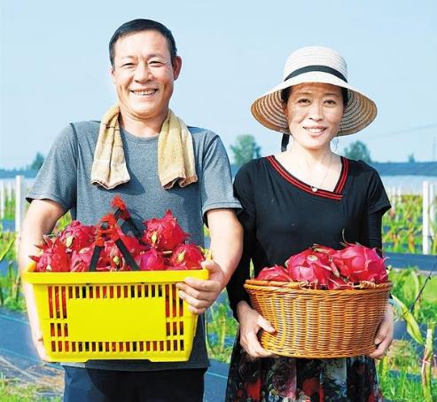 盛夏時(shí)節(jié),萬木蔥蘢。在太康縣清集鎮(zhèn)夢(mèng)里田園火龍果種植基地,一株株仙人掌狀的火龍果成行排列,一個(gè)個(gè)飽滿的火龍果如火焰般垂掛枝頭。打扮利落的劉秀英邊用手機(jī)拍攝火龍果果皮上黃綠相間的鱗狀花萼,邊向粉絲介紹火龍果的長(zhǎng)勢(shì)和收成情況。