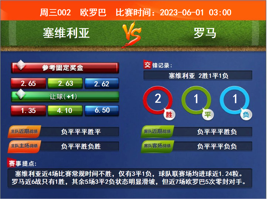 比賽時間:2023-06-01 03:00賽事提點(diǎn):塞維利亞近4場比賽常規(guī)時間不勝,僅有3平1負(fù),球隊(duì)聯(lián)賽場均進(jìn)球近1.24粒。羅馬近6戰(zhàn)只有1勝,其余5場3平2負(fù)狀態(tài)明顯滑坡,但近7場歐羅巴5次零封對手。