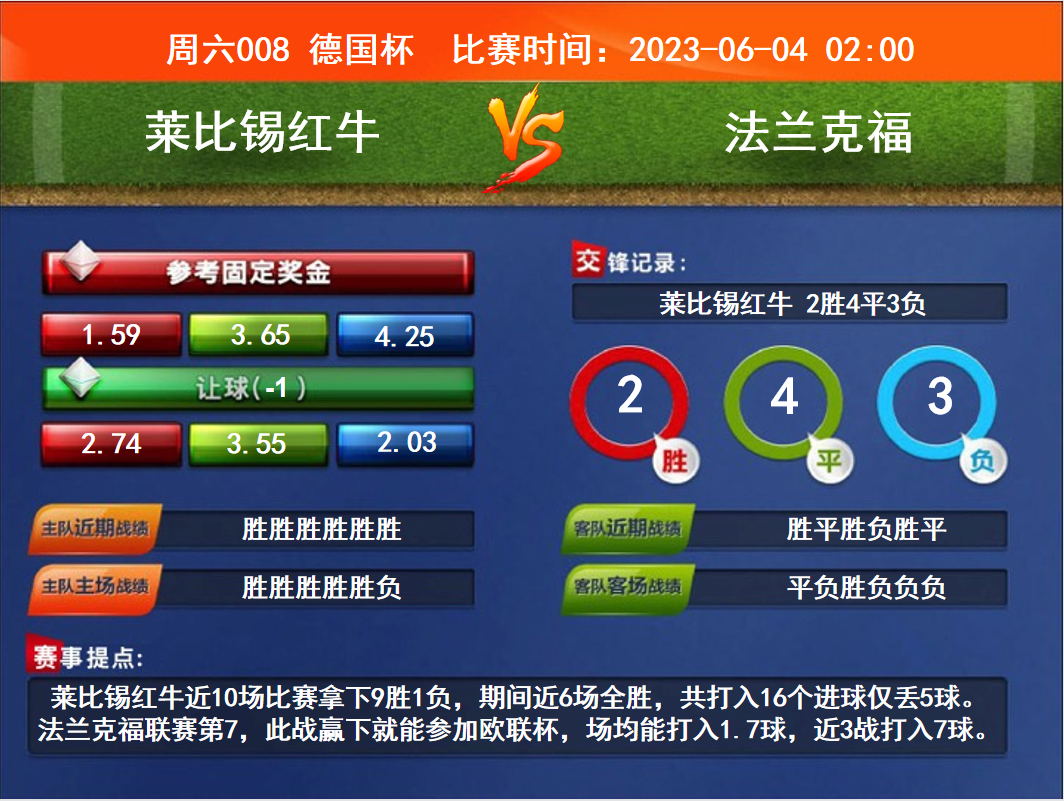 比賽時(shí)間:2023-06-04 02:00賽事提點(diǎn):萊比錫紅牛近10場比賽拿下9勝1負(fù),期間近6場全勝,共打入16個(gè)進(jìn)球僅丟5球。法蘭克福聯(lián)賽第7,此戰(zhàn)贏下就能參加歐聯(lián)杯,場均能打入1.7球,近3戰(zhàn)打入7球。
