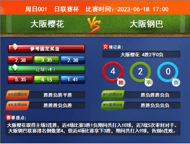 比賽時間:2023-06-18 17:00賽事提點:大阪櫻花取得主場3連勝,近4場比賽3勝1負期間共打入10球,近7戰(zhàn)5次零封對手。大阪鋼巴聯(lián)賽排名倒數(shù)第4,但近4場比賽拿下3勝,期間共打入9球,告別6連敗。