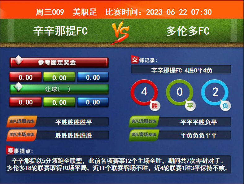 比賽時間:2023-06-22 07:30賽事提點:辛辛那提以5分領跑全聯盟,此前各項賽事12個主場全勝,期間共7次零封對手。多倫多18輪聯賽取得10場平局,近11個聯賽客場不勝,近4輪聯賽1勝3平保持不敗。