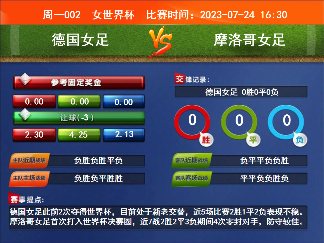 比賽時(shí)間:2023-07-24 16:30賽事提點(diǎn):德國(guó)女足此前2次奪得世界杯,目前處于新老交替,近5場(chǎng)比賽2勝1平2負(fù)表現(xiàn)不穩(wěn)。摩洛哥女足首次打入世界杯決賽圈,近7戰(zhàn)2勝2平3負(fù)期間4次零封對(duì)手,防守較佳。