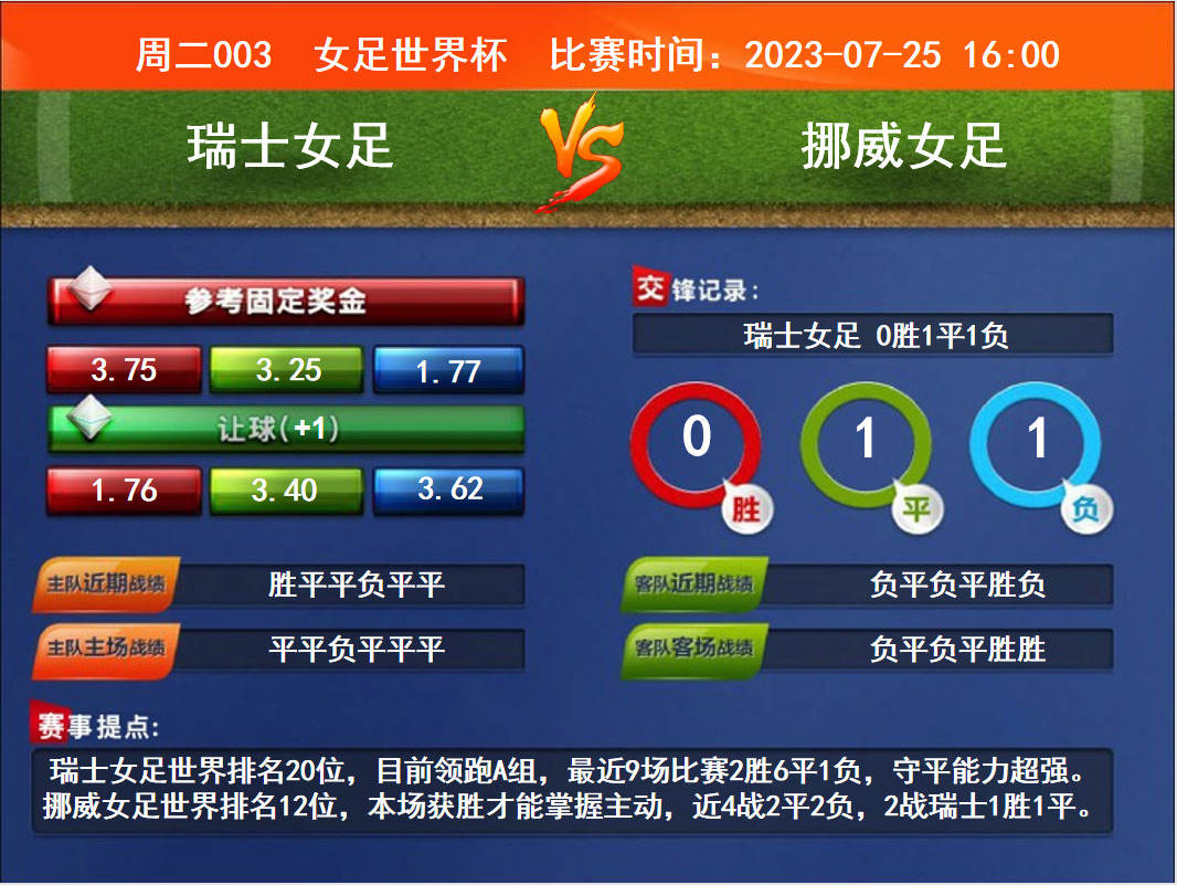 比賽時間:2023-07-25 16:00賽事提點:瑞士女足世界排名20位,目前領(lǐng)跑A組,最近9場比賽2勝6平1負,守平能力超強。挪威女足世界排名12位,本場獲勝才能掌握主動,近4戰(zhàn)2平2負,2戰(zhàn)瑞士1勝1平。