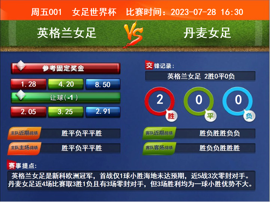 比賽時間:2023-07-28 16:30賽事提點(diǎn):英格蘭女足是新科歐洲冠軍,首戰(zhàn)僅1球小勝海地未達(dá)預(yù)期,近5戰(zhàn)3次零封對手。丹麥女足近4場比賽取3勝1負(fù)且有3場零封對手,但3場勝利均為一球小勝優(yōu)勢不大。