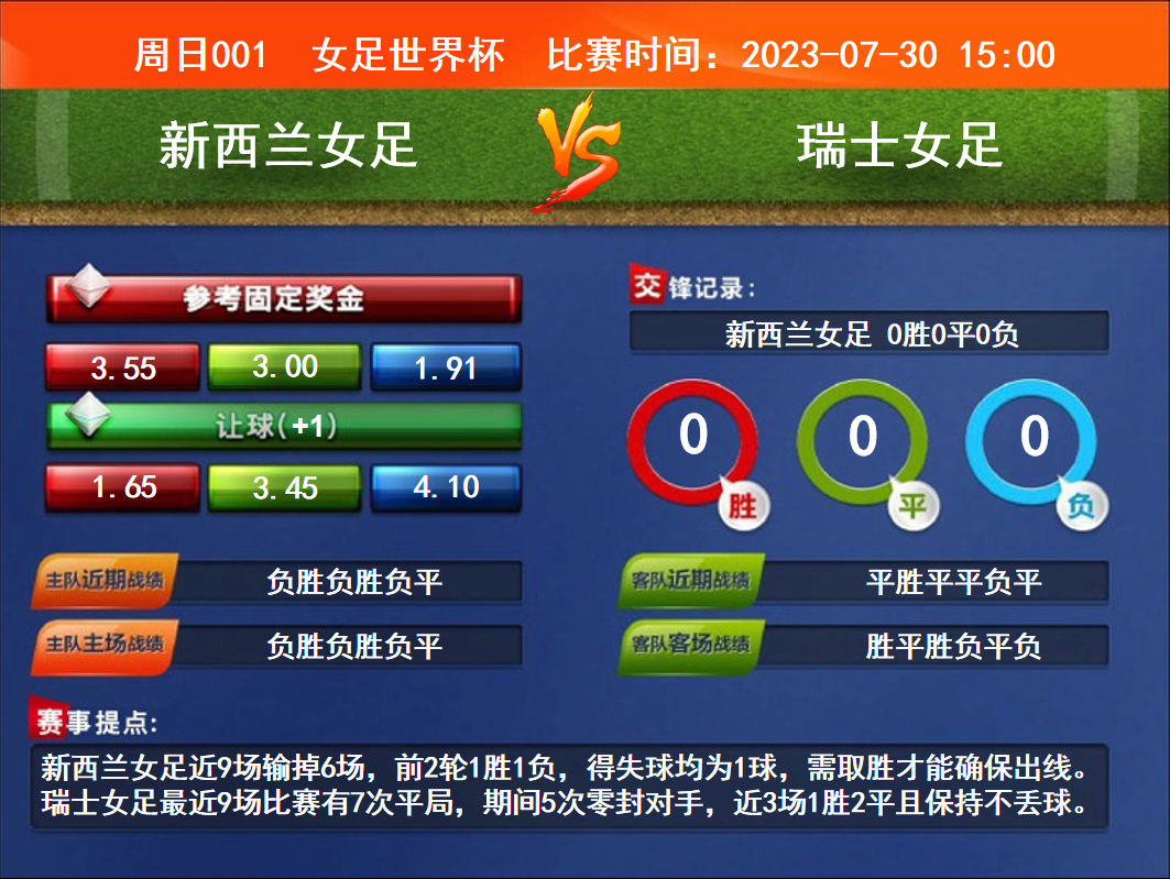 比賽時(shí)間:2023-07-30 15:00賽事提點(diǎn):新西蘭女足近9場(chǎng)輸?shù)?場(chǎng),前2輪1勝1負(fù),得失球均為1球,需取勝才能確保出線。瑞士女足最近9場(chǎng)比賽有7次平局,期間5次零封對(duì)手,近3場(chǎng)1勝2平且保持不丟球。