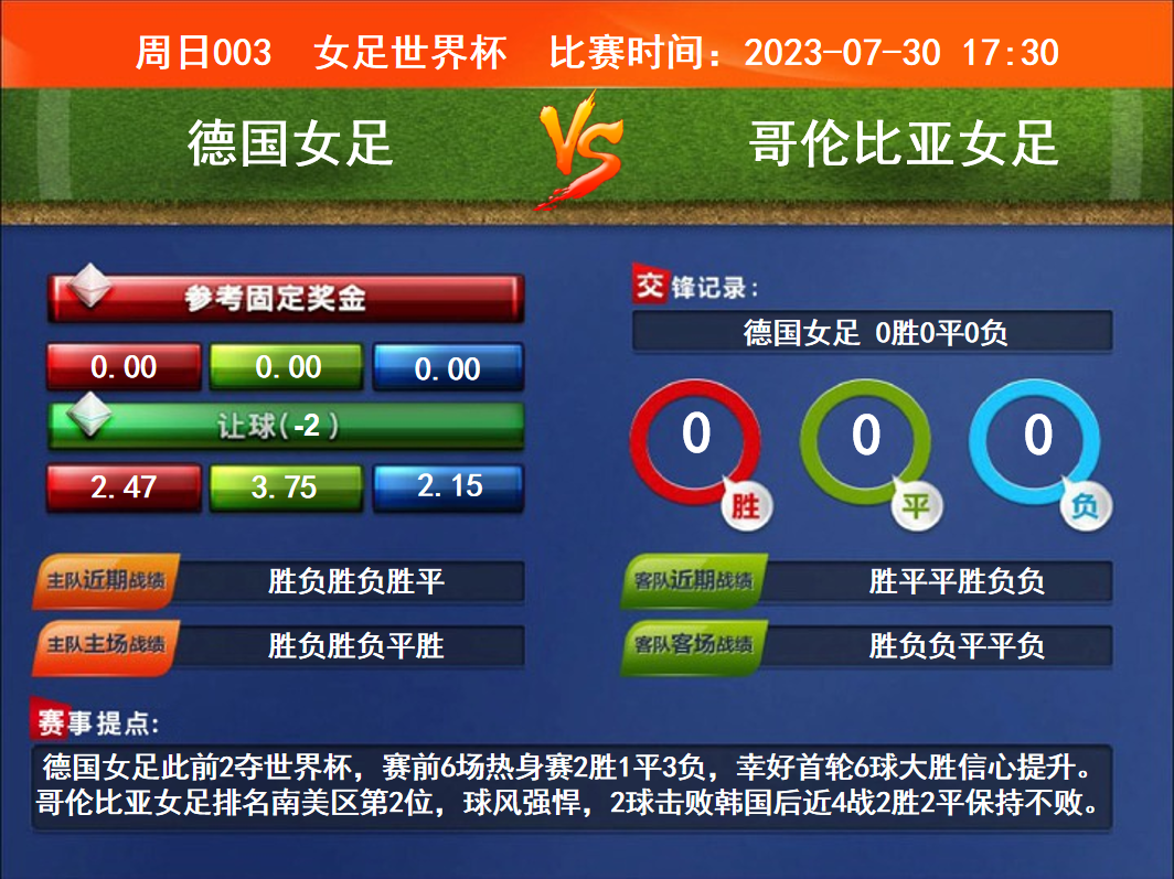 比賽時(shí)間:2023-07-30 17:30賽事提點(diǎn):德國(guó)女足此前2奪世界杯,賽前6場(chǎng)熱身賽2勝1平3負(fù),幸好首輪6球大勝信心提升。哥倫比亞女足排名南美區(qū)第2位,球風(fēng)強(qiáng)悍,2球擊敗韓國(guó)后近4戰(zhàn)2勝2平保持不敗。