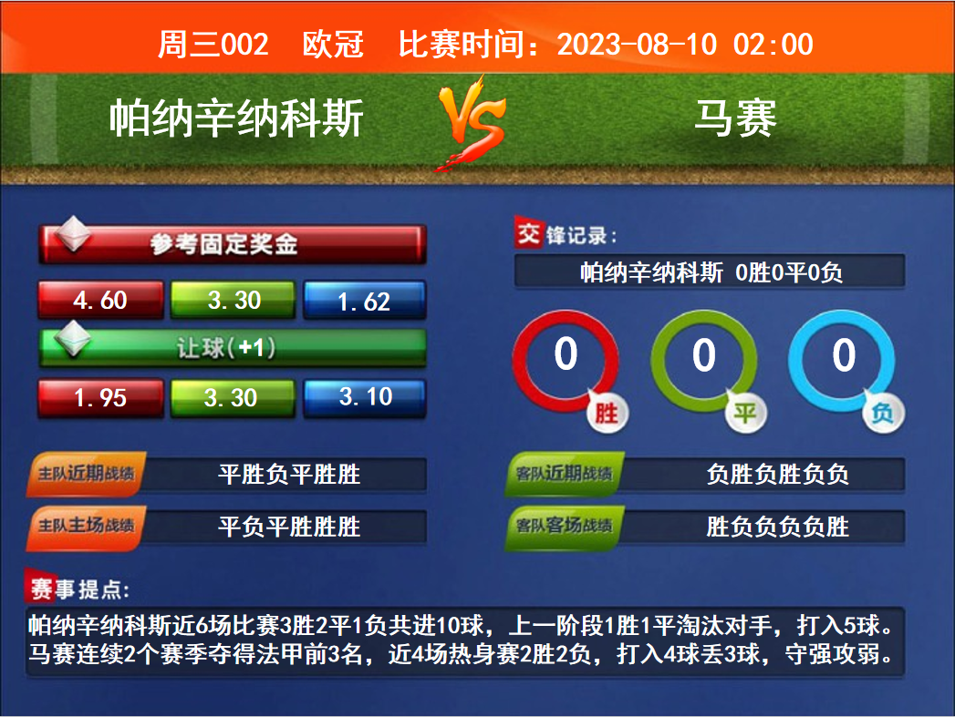 馬賽 比賽時間:2023-08-10 02:00賽事提點:帕納辛納科斯近6場比賽3勝2平1負共進10球,上一階段1勝1平淘汰對手,打入5球。馬賽連續(xù)2個賽季奪得法甲前3名,近4場熱身賽2勝2負,打入4球丟3球,守強攻弱。