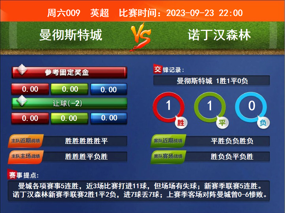 比賽時(shí)間:2023-09-23 22:00賽事提點(diǎn):曼城各項(xiàng)賽事5連勝,近3場比賽打進(jìn)11球,但場場有失球;新賽季聯(lián)賽5連勝。諾丁漢森林新賽季聯(lián)賽2勝1平2負(fù),進(jìn)7球丟7球;上賽季客場對陣曼城曾0-6慘敗。